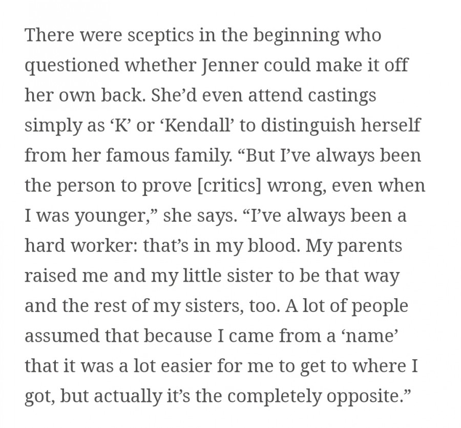 금수저 논란에 대해 자신이 특혜를 받은 것을 알고 있다며 특권층의 죄책감과 자신의 부모님이 자수성가로 성공한 것을 기리기 위해 열심히 일하고, 노력하며 자신의 엄마처럼 전 세계의 많은 여자애들이 미친 듯이 열심히 일 한다는 것을 안다며 다른 여자 모델들과 함께 백스테이지에 옆에 같이 일하면서 자신이 그들한테 존경을 바라거나 자신의 존재로 가리거나 자리를 빼았으려고 온 것이 아니라는 걸 알아줬으며 좋겠다며 해명함