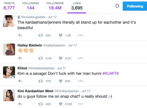 킴 카다시안이 테일러가 거짓말한다고 스냅챗 편집본 올렸을 당시의 트윗들 (밑에서 위로)