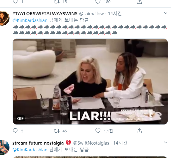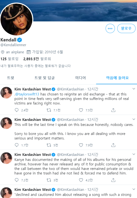| 칸예&킴 카다시안 거짓말 밝혀지고 나서 테일러 스위프트의 반응 (0) | 2020.03.23 |