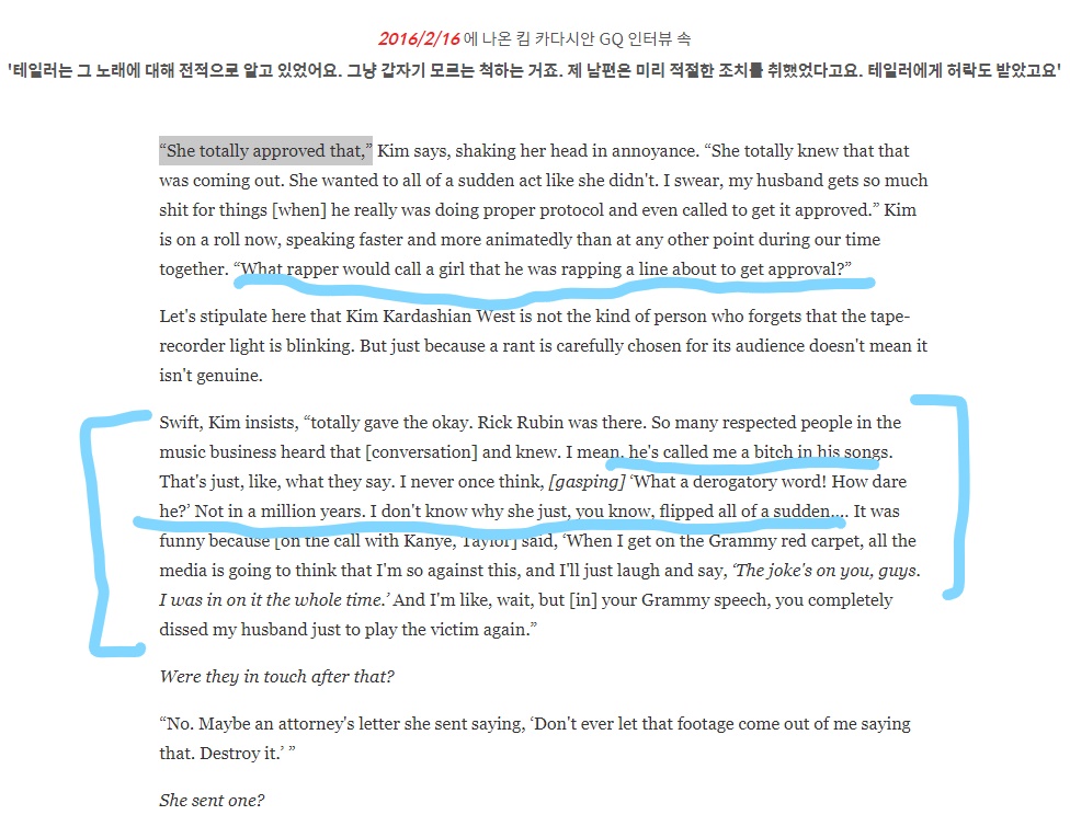 3. 분명히, 내가 전에 테일러가 거짓말을 하고 있다고 지적한 건 '칸예는 테일러에게 허락을 구하기 위해 전화를 한 적 없다'라는 거야. 둘은 분명히 전화를 했고, 아무도 bitch라는 단어를 테일러가 허락하지 않았다는 걸 부정한 적 없어