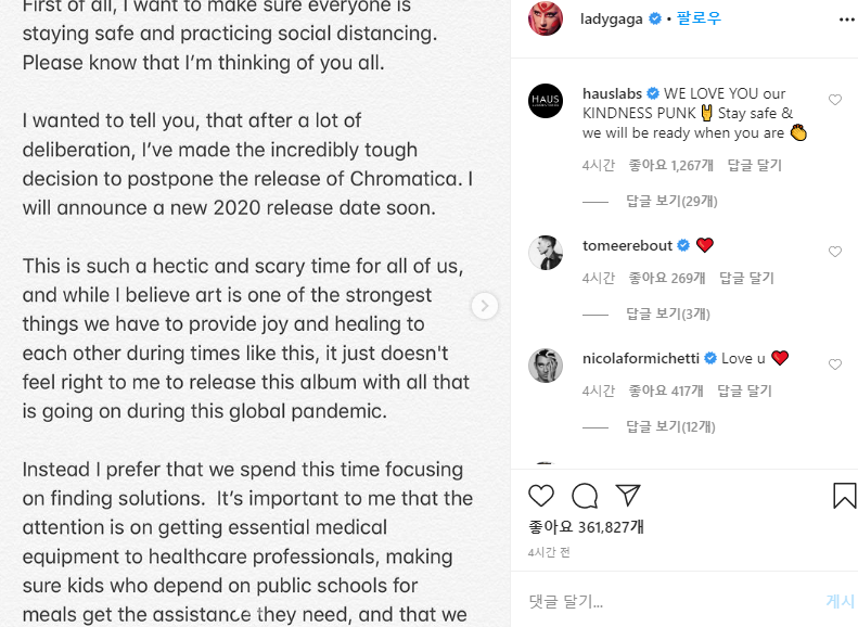 몇 시간 전 올라온 레이디 가가 인스타그램