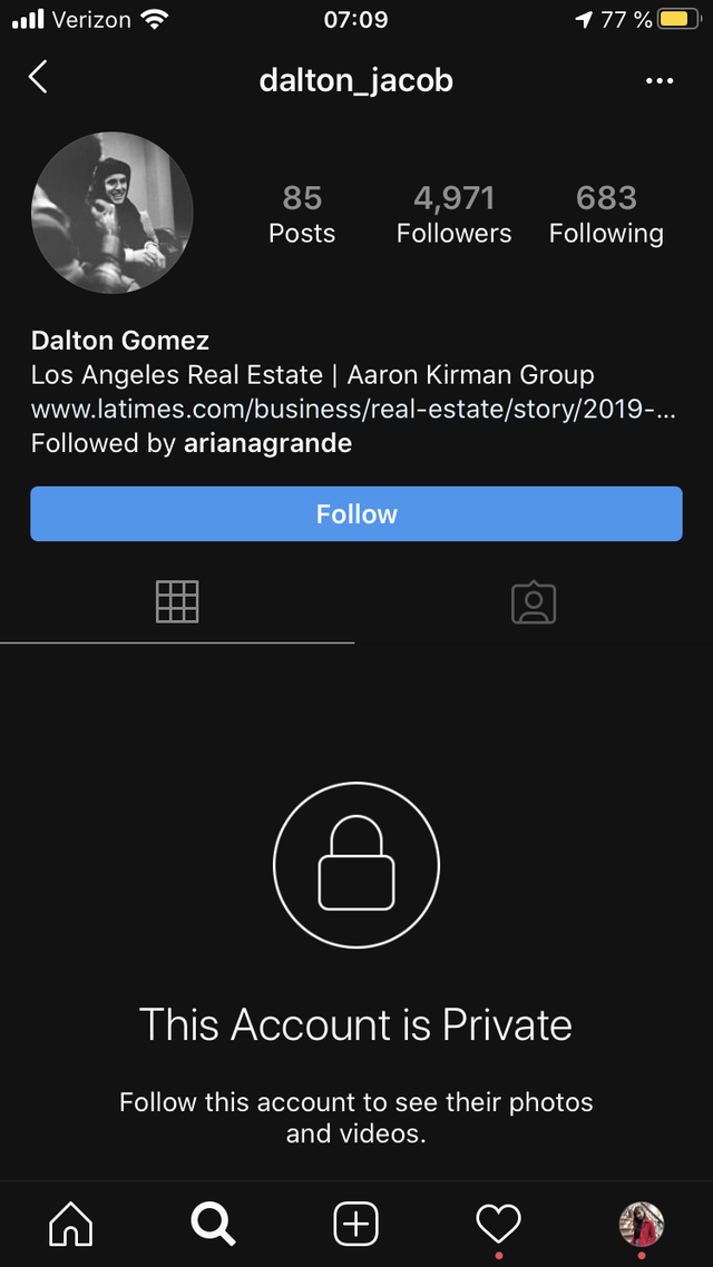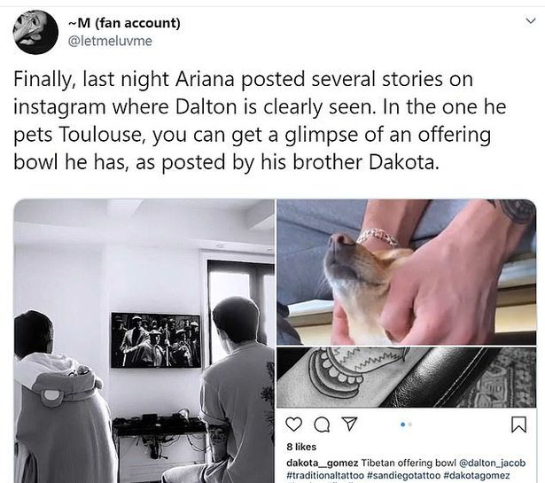 달튼 고메즈의 인스타그램은 비공개이지만 아리아나 그란데가 팔로우한 것을 알 수 있고,