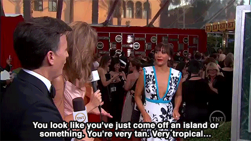 인터뷰어 : 어머! 섬에 놀러 갔다 왔나 봐요! 굉장히 탔네요, 매우 이국적이에요~