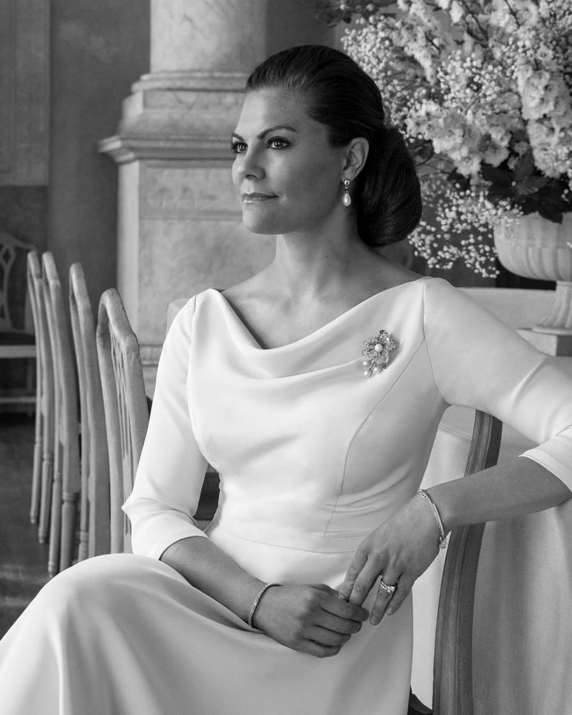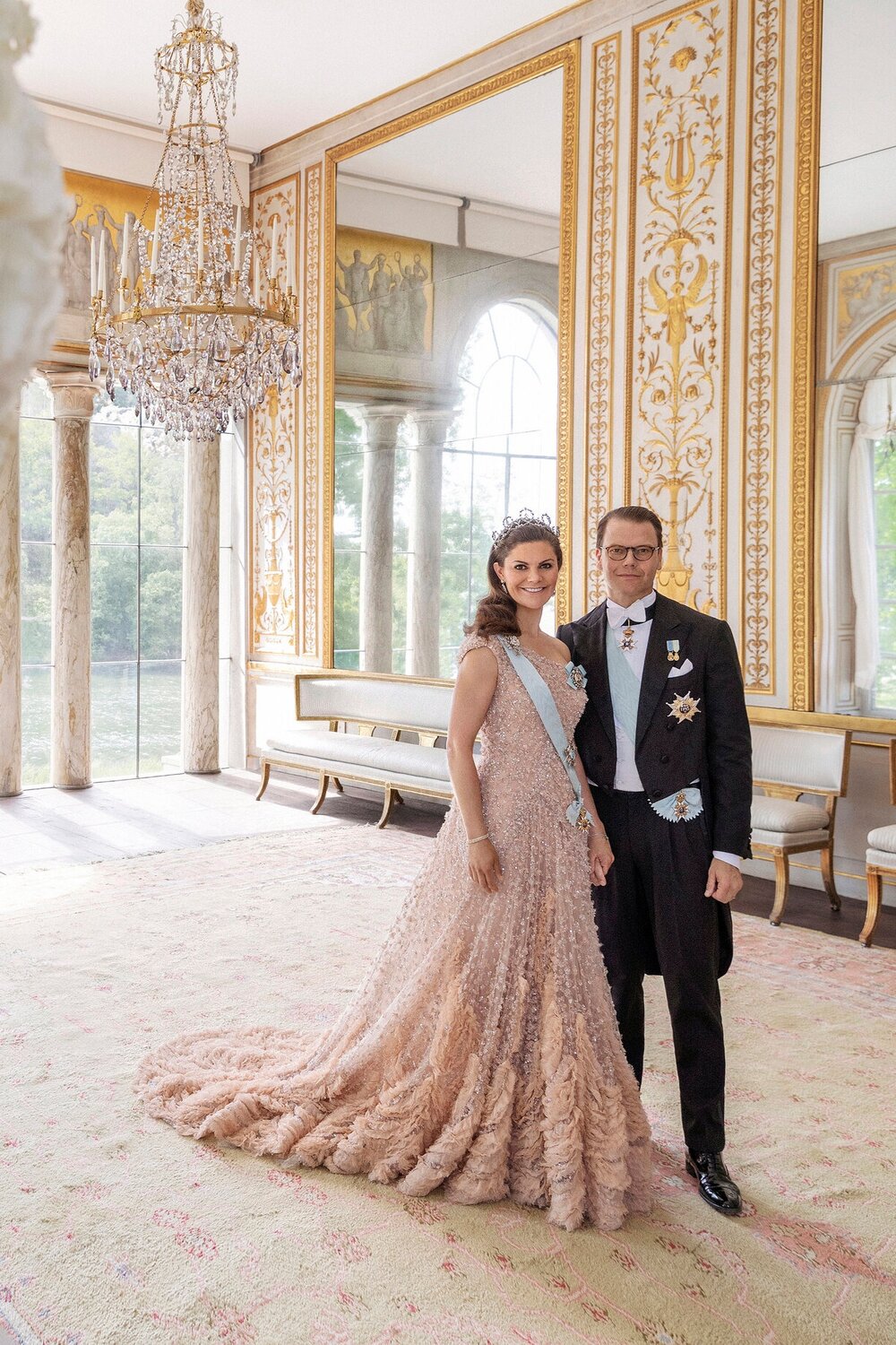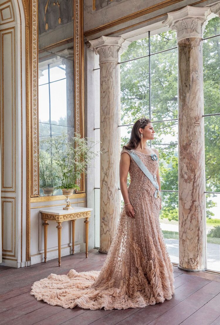 구스타프 3세 파빌리온에서, 결혼 10주년 기념사진 속 총 네벌을 갈아입은 빅토리아 왕세녀는 위 사진에서는 핑크 아이보리 엘리 사브 드레스와 본인이 직접 자신의 페이보릿!이라고 밝힌 Connaught Diamond 티아라와 함께했는데요. 이 엘리 사브 드레스는 10년전, 결혼식 이브닝 파티 때 입은 드레스를 다시 재활용한 것!
