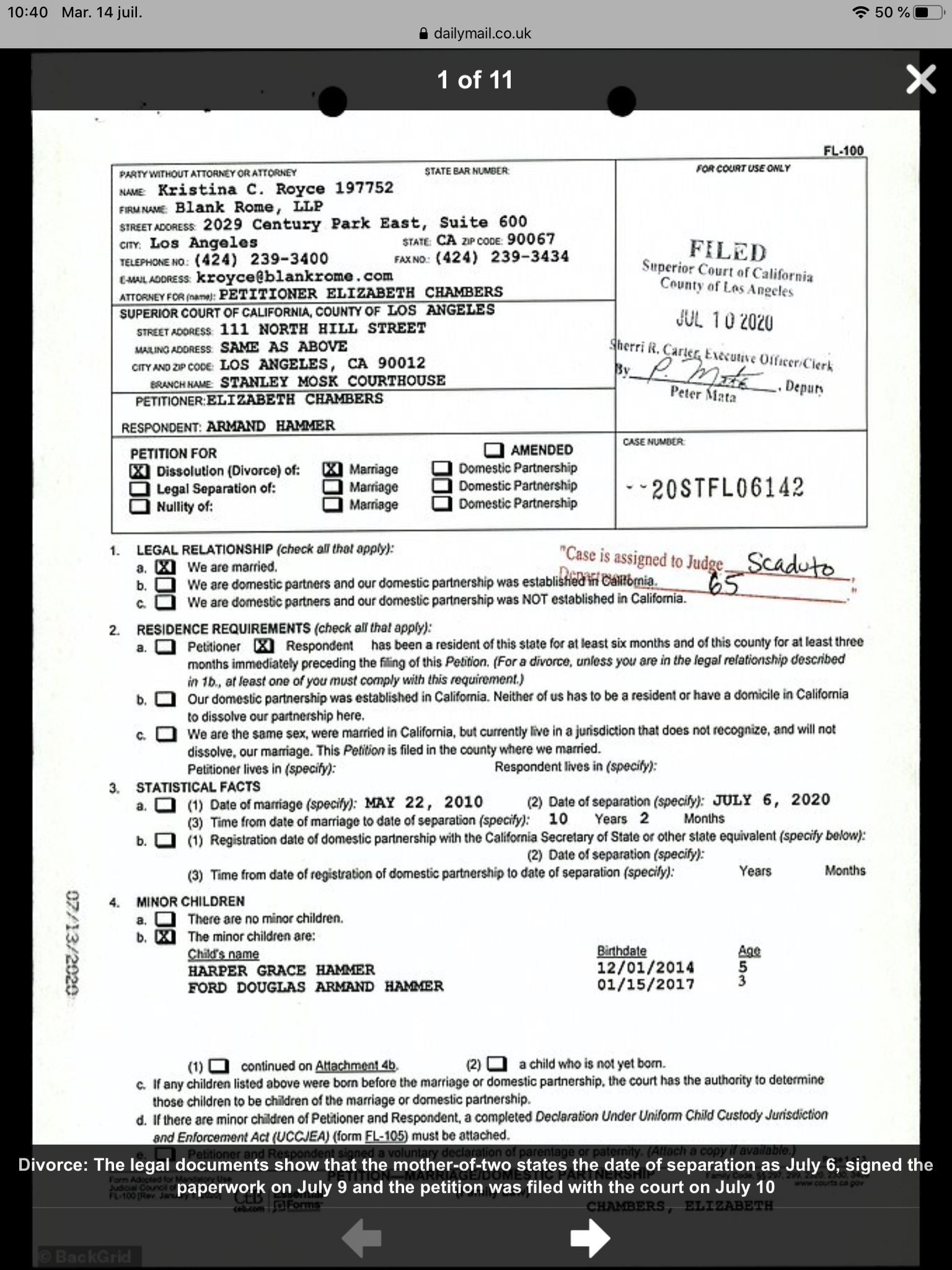 엘리자베스 챔버스는 인스타그램으로 이혼 발표를 하기 전 이미 아미 해머를 상대로 이혼 소송을 낸 상태입니다. 엘리자베스 챔버는 해소할 수 없는 차이(Irreconcilable diffrences)를 이유로 적어냈고, 현재 두 자녀들의 단독 양육권을 주장하고 있습니다. 아미 해머는 공동 양육권을 주장하고 있고요