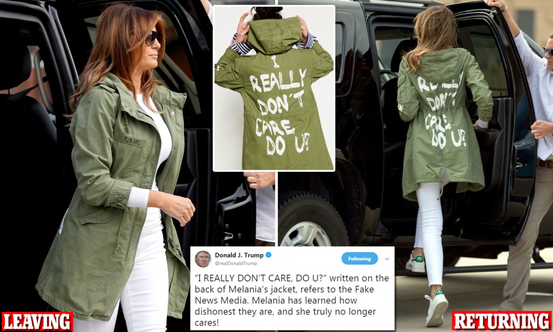 이러한 자라 재킷이 정말 엄청난 논란을 불어 일으키자 트위터광 트럼프 대통령은 멜라니아가 자라 재킷을 입은 것은 페이크 뉴스를 보도하는 언론에 대해 전하는 메시지라고 해명했는데요