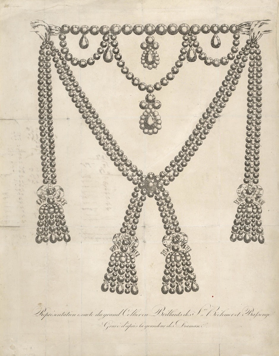 1772년, 루이 16세의 할아버지이자 프랑스 왕실의 재정 악화를 특급열차 수준으로 가열하게 주도했던 루이 15세는 자신이 애정 하는 정부 마담 뒤바리를 위해 굶어 죽어가는 프랑스 국민들은 상상하지도 못하는 거금을 가지고 왕실 보석상 샤를 아우구스트 베머에게 찾아가 다른 목걸이들을 모두 능가하는 아름다운 다이아몬드 목걸이를 만들라 의뢰합니다.