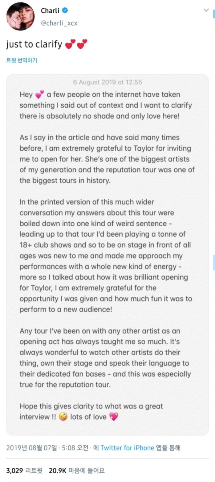 근데 최근 찰리 XCX와 피치포크와 한 인터뷰에서 테일러 스위프트 투어에 선 경험을