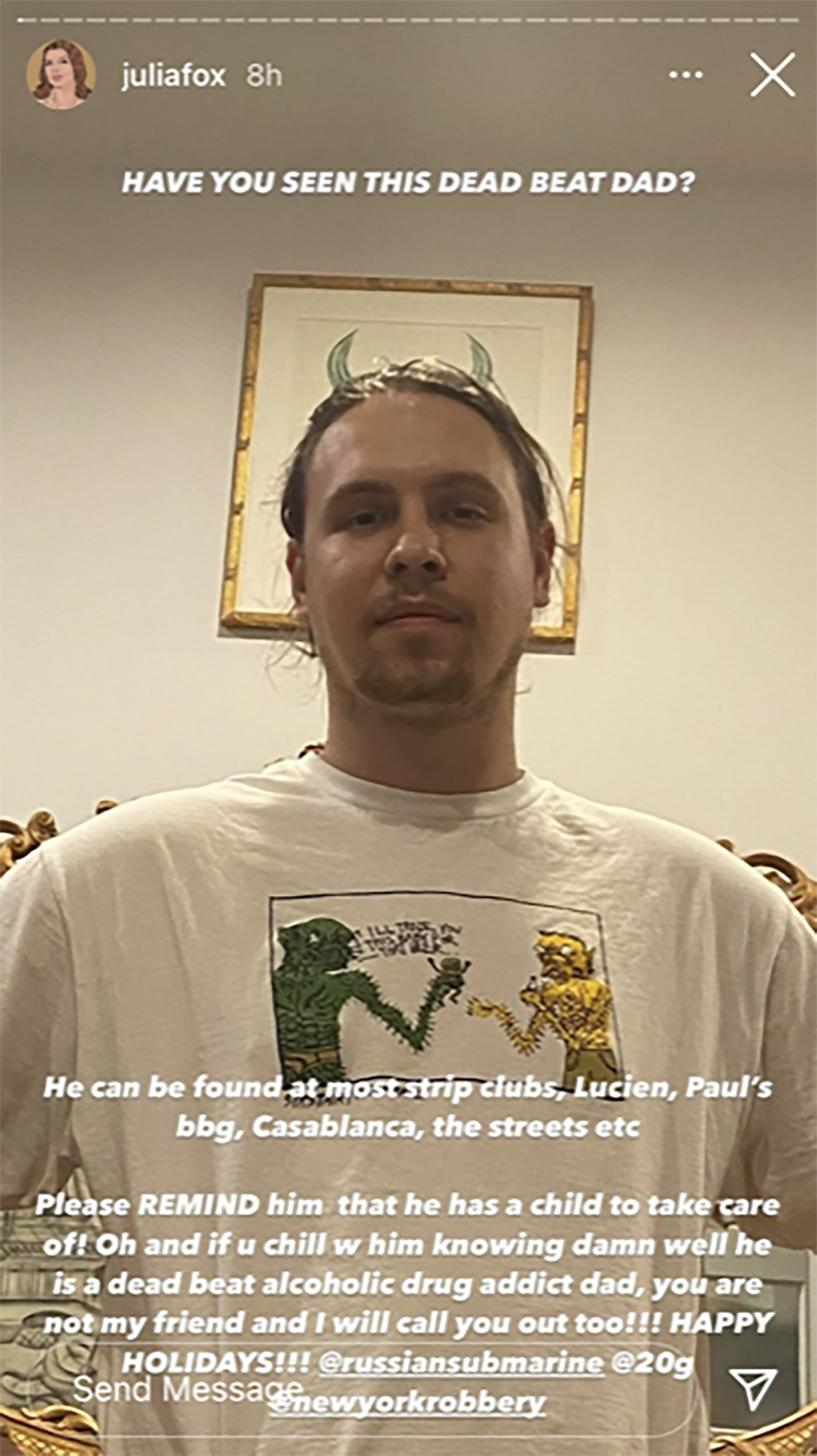 하지만 딱히 좋은 남편, 아빠는 아녔는지 줄리아 폭스는 인스타 스토리로 아내와 5달 된 아이를 두고 떠났다며 사회 낙오자(deadbeat), 알코올 중독이라며 전남편을 인스타 스토리에서 저격했는데