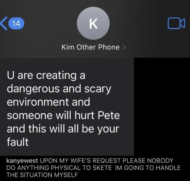 몇 달간의 칸예 공격에 더 이상 조용히 있진 않겠다 하면서 피트 데이비슨이 공개한 칸예와의 문자 메시지. 하지만 피터 데이빈슨도 칸예와 거기서 거기, 똑같은 수준인 것이 칸예 멘탈 케어를 도와주겠다면서 '난 침대에 니 아내랑 있음ㅋ'이라는 칸예를 자극하기 발언😮💨