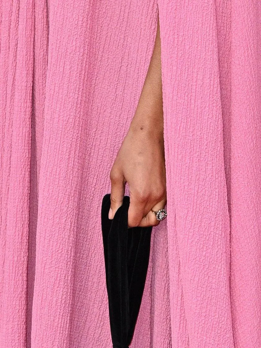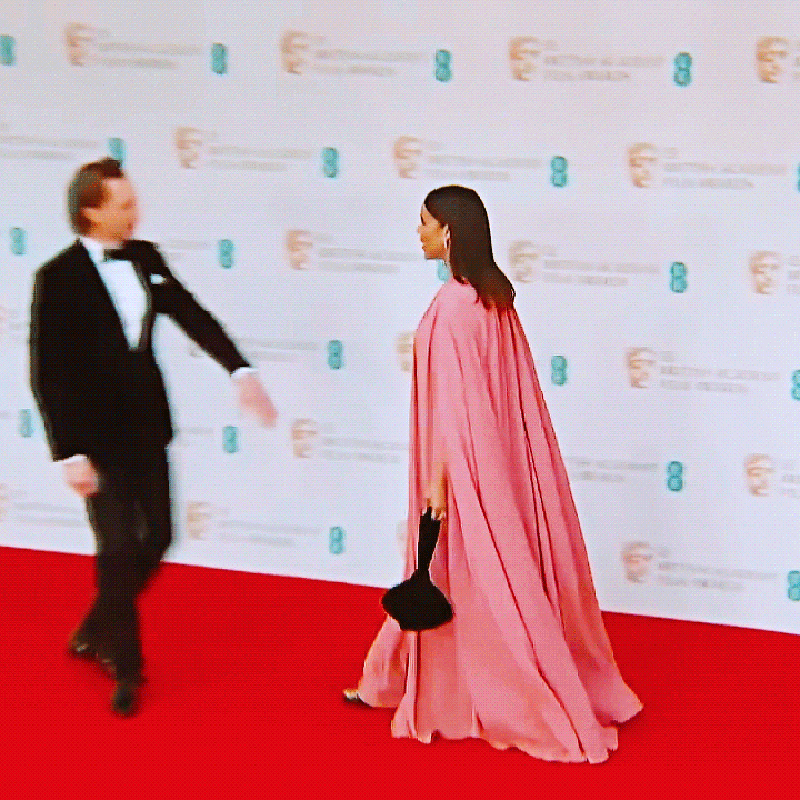 캐롤리나 헤레라 벨벳 턱시도 차림의 톰 히들스턴과 영국 럭셔리 패션 브랜드 에밀리아 윅스테드 핑크 드레스와 까르띠에 주얼리를 착용한 자웨 애쉬튼. 특히나 약혼자 톰 히들스턴의 슈트 재질에 맞추어 벨벳 블랙 백을 들어주는 센스.