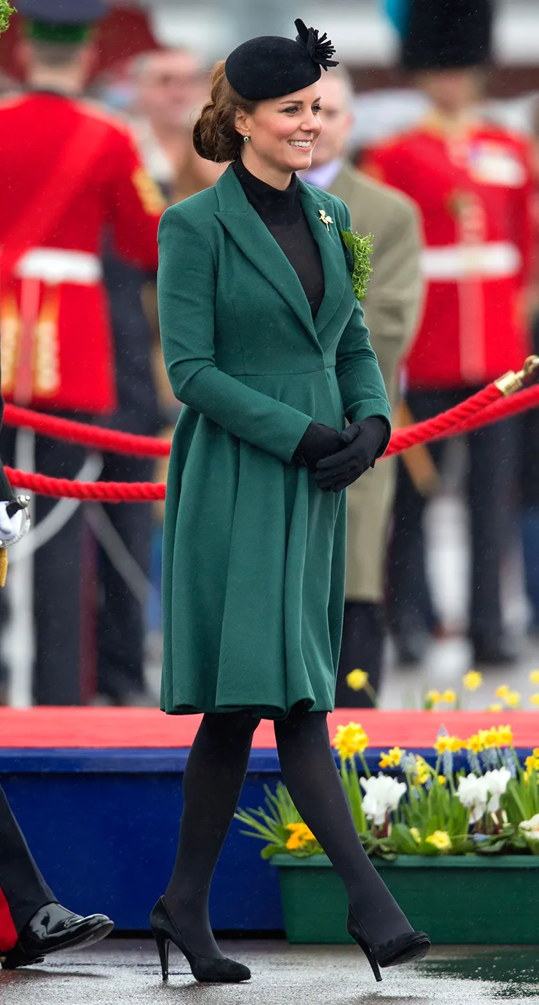 다이아몬드 에메랄드 귀걸이와 함께 착용한 가운데 에메랄드가 박혀있는 아일랜드 상징인 토끼풀(Shamrock) 브로치는 퀸 마더 퀸 마더 시절 제작된 것으로 추측돼 만들어진지 120년이 넘은 역사 깊은 브로치. 퀸 마더 사후 엘리자베스 2세 여왕에서 물려 이제는 세인트 패트릭 데이 때마다 케이트 미들턴이 착용 중