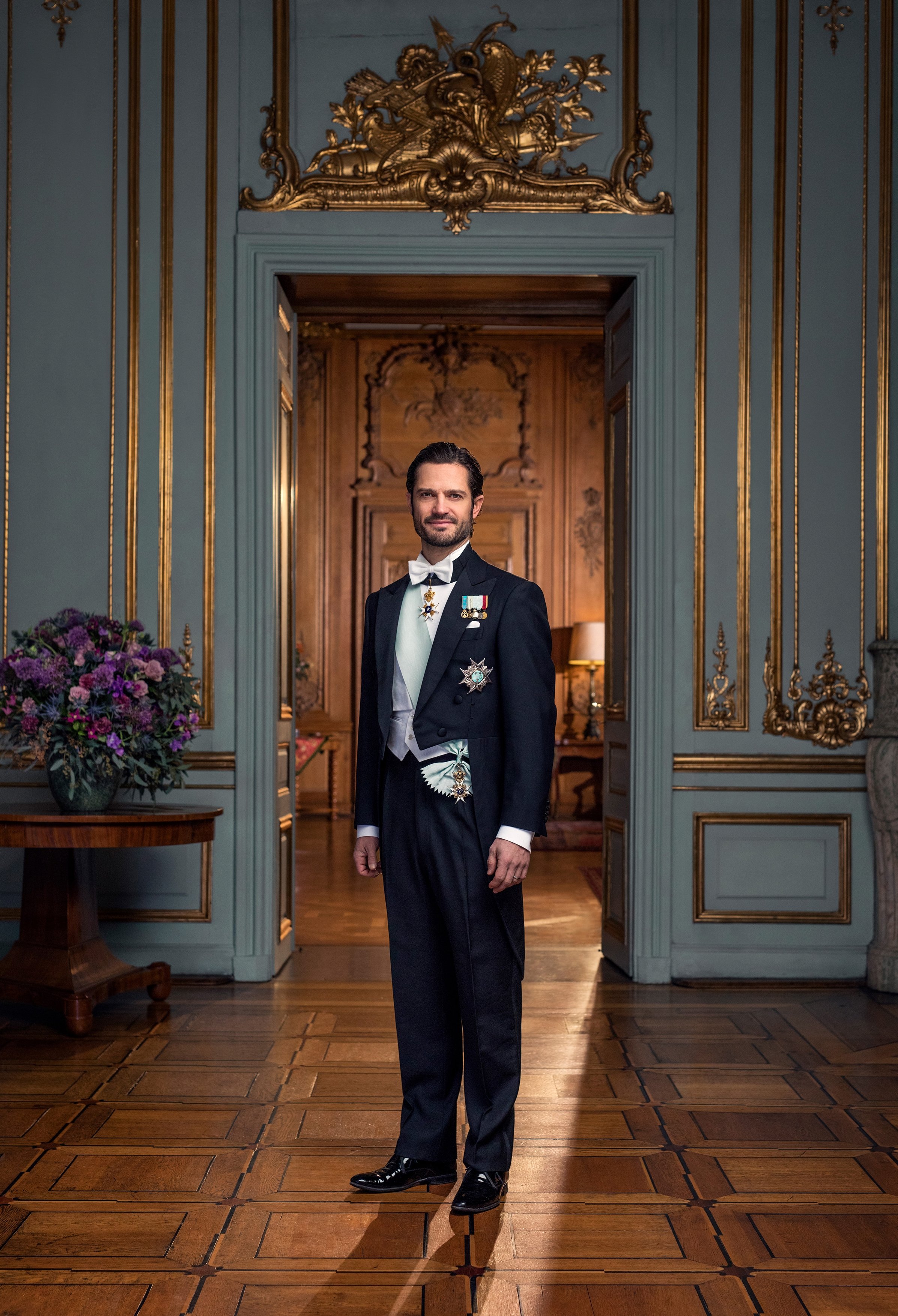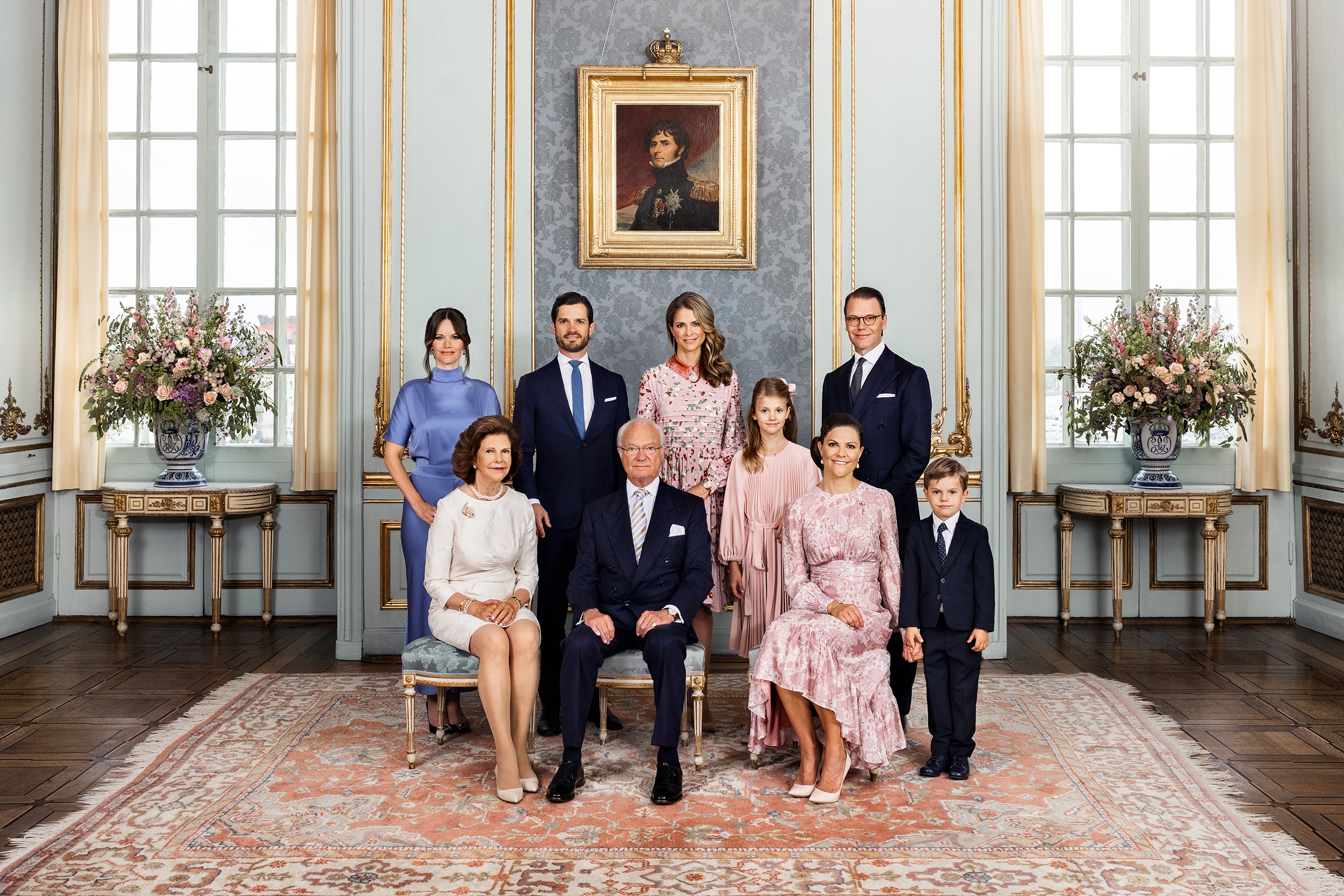 (현) 스웨덴 왕실의 조상이자 베르나도테 왕가 가문의 시조 칼 14세 요한의 초상화를 배경으로 스톡홀름 궁에서 궁정 전용 사진작가가 촬영한 공식 가족사진을 같이 공개했습니다.
