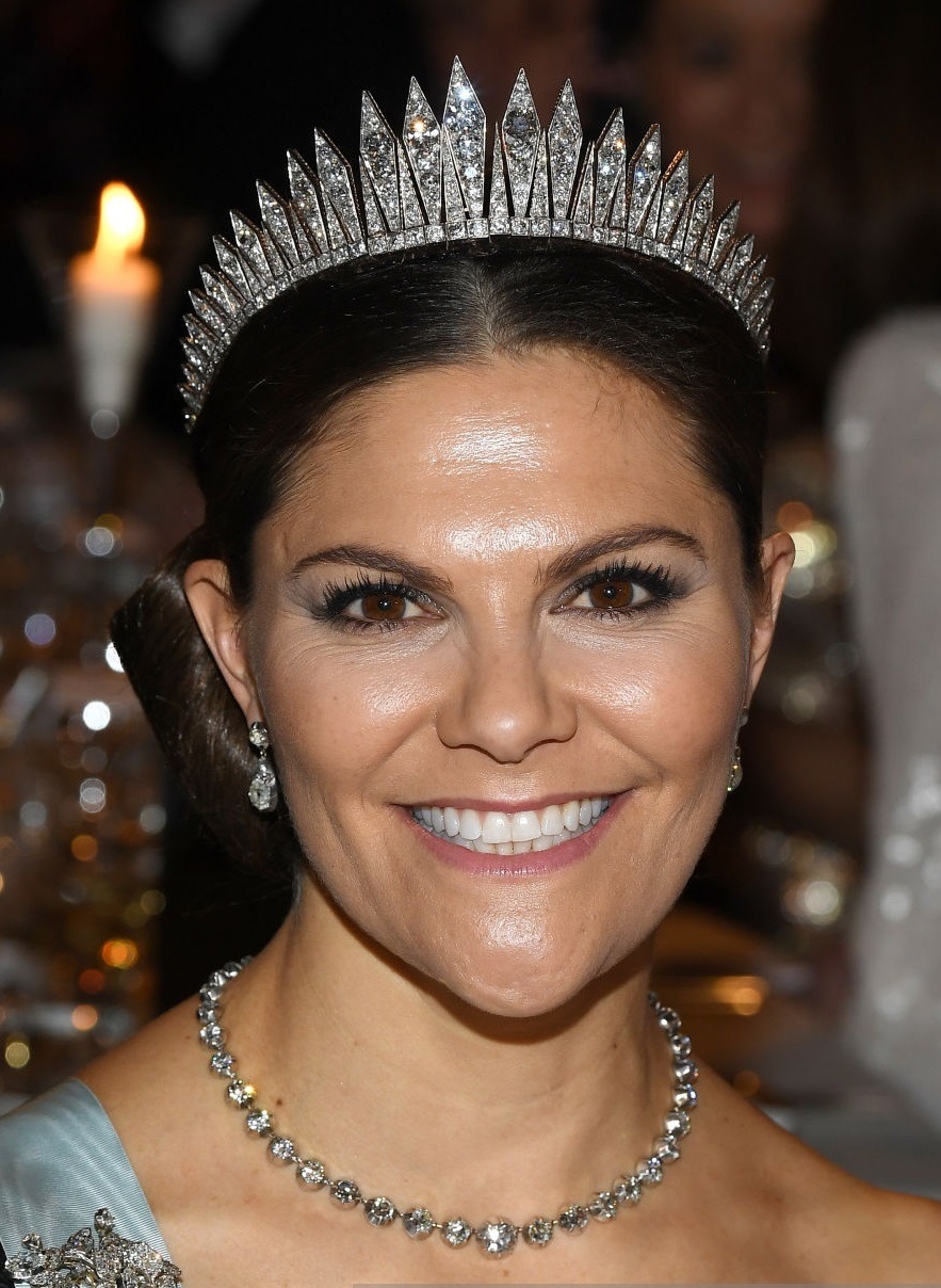 스웨덴 마들렌 공주가 2013년, 본인 결혼식 때 착용한 모던 프린지 티아라. 현재 마들렌 공주가 스웨덴 왕실 화이트 타이 이벤트에서 가장 자주 착용하는 티아라 중 하나로 티아라 형태뿐만 아니라 목걸이로도 활용 가능합니다.