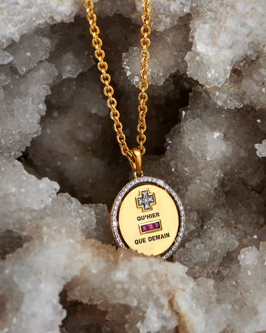 프랑스 시인 로즈몽드 제라드의 시 The Eternal Song 구절인 보시다시피, 저는 매일 당신을 어제보다 더 내일보다 덜 사랑합니다. 에서 따온 'qu’hier and que demain'의 문구를 세긴 펜던트라고 하네요📿