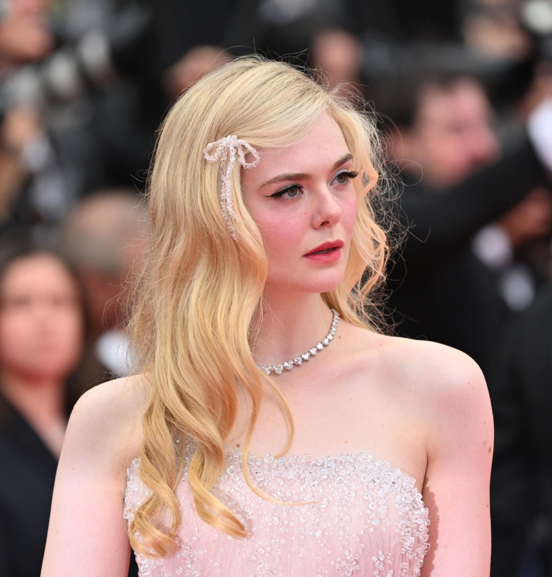 칸 영화제 공식 후원사 쇼파드의 하트 모양 다이아몬드 목걸이와 함께 아르마니 프리베의 연핑크색 드레스와 맞춘 리본을 머리카락에 살며시 달아 완성한 레드카펫 룩🍑 표현하자면 개저씨같지만 초상큼 그자체..