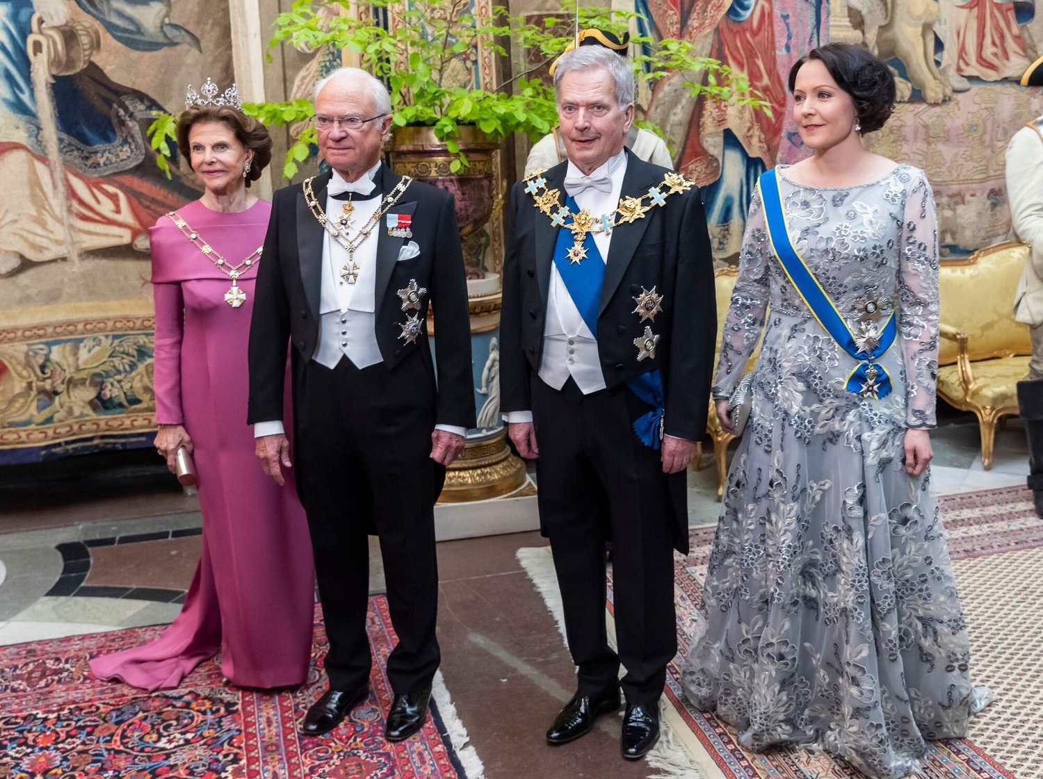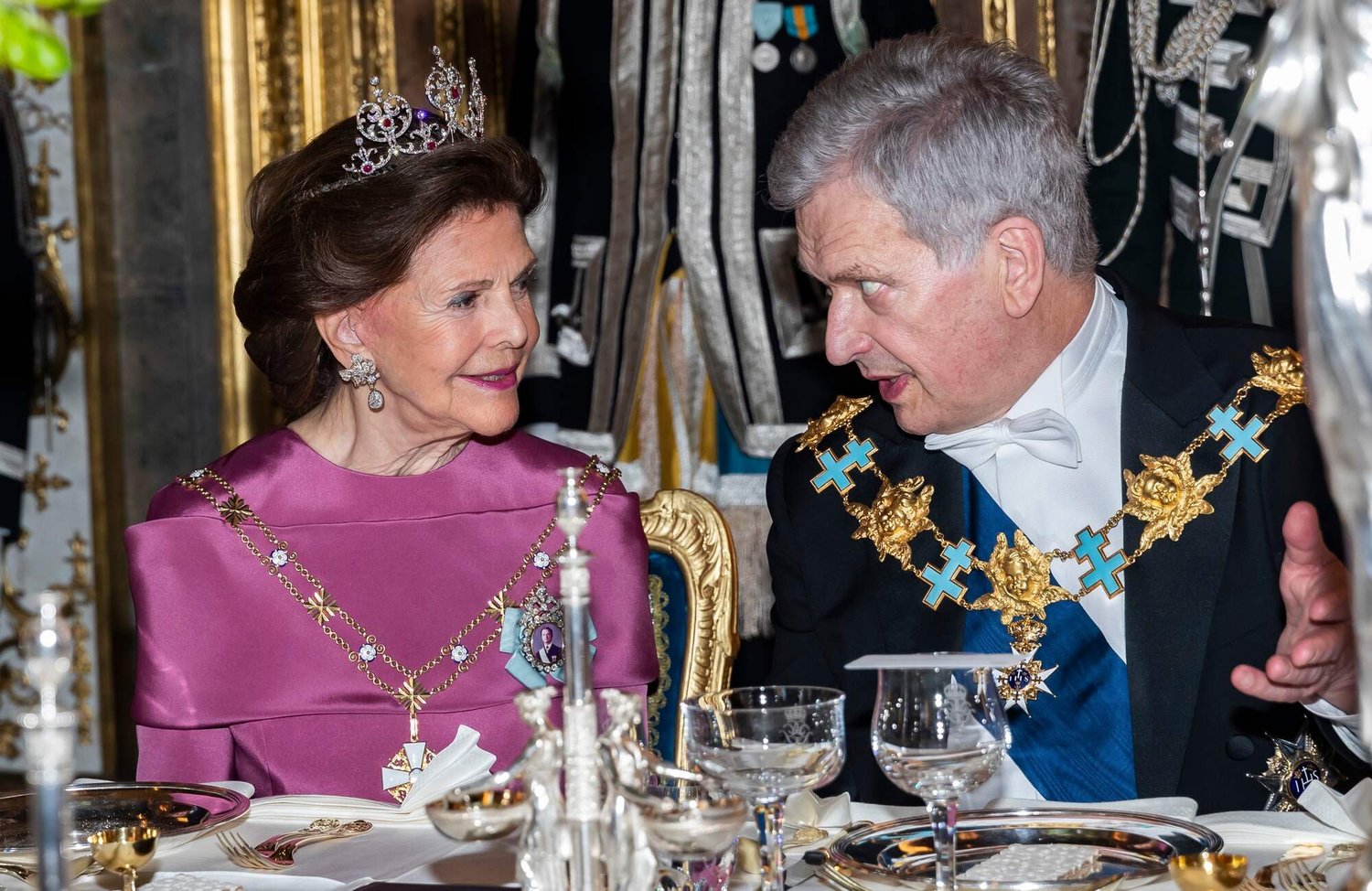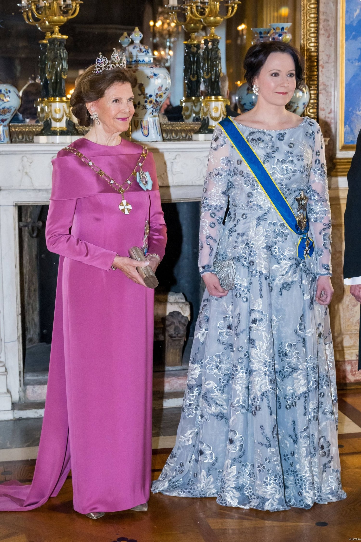스웨덴 국왕 부부가 착용한 🌹백장미 훈장 사슬🌹은 핀란드 훈장 중 하나로 원래대로라면 핀란드 대통령이 써야 하나 이번에 스웨덴과 핀란드의 연대를 강조하기 위함인지 스웨덴 국왕 부부가, 핀란드 대통령은 백장미 훈장 사슬이 아닌 스웨덴의 가장 상위 훈장인 ⭐세라핌 훈장 사슬⭐을 착용했네요.