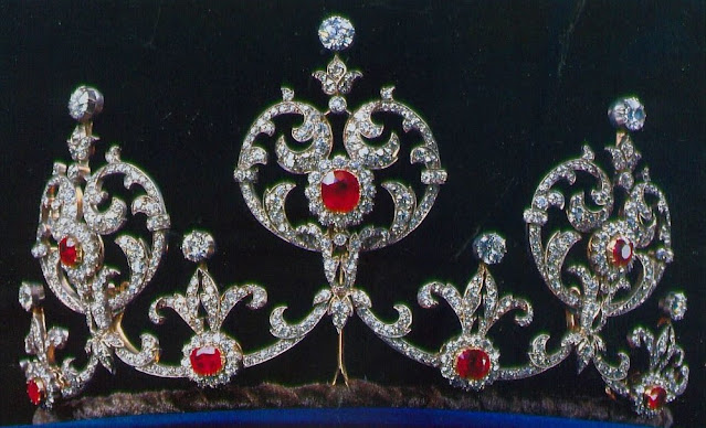 실비아 왕비는 마치 둥그런 하트 모양으로 된 큰 3개의 소용돌이무늬에 7개의 루비가 박혀 있는 다이아몬드 티아라를 착용했어요. 사실 실비아 왕비가 자주 착용하고 나오는 티아라는 아닌데요, 심지어 공주들 또한 착용한 적도 없고요.
