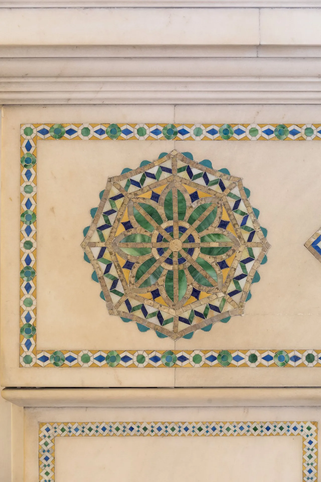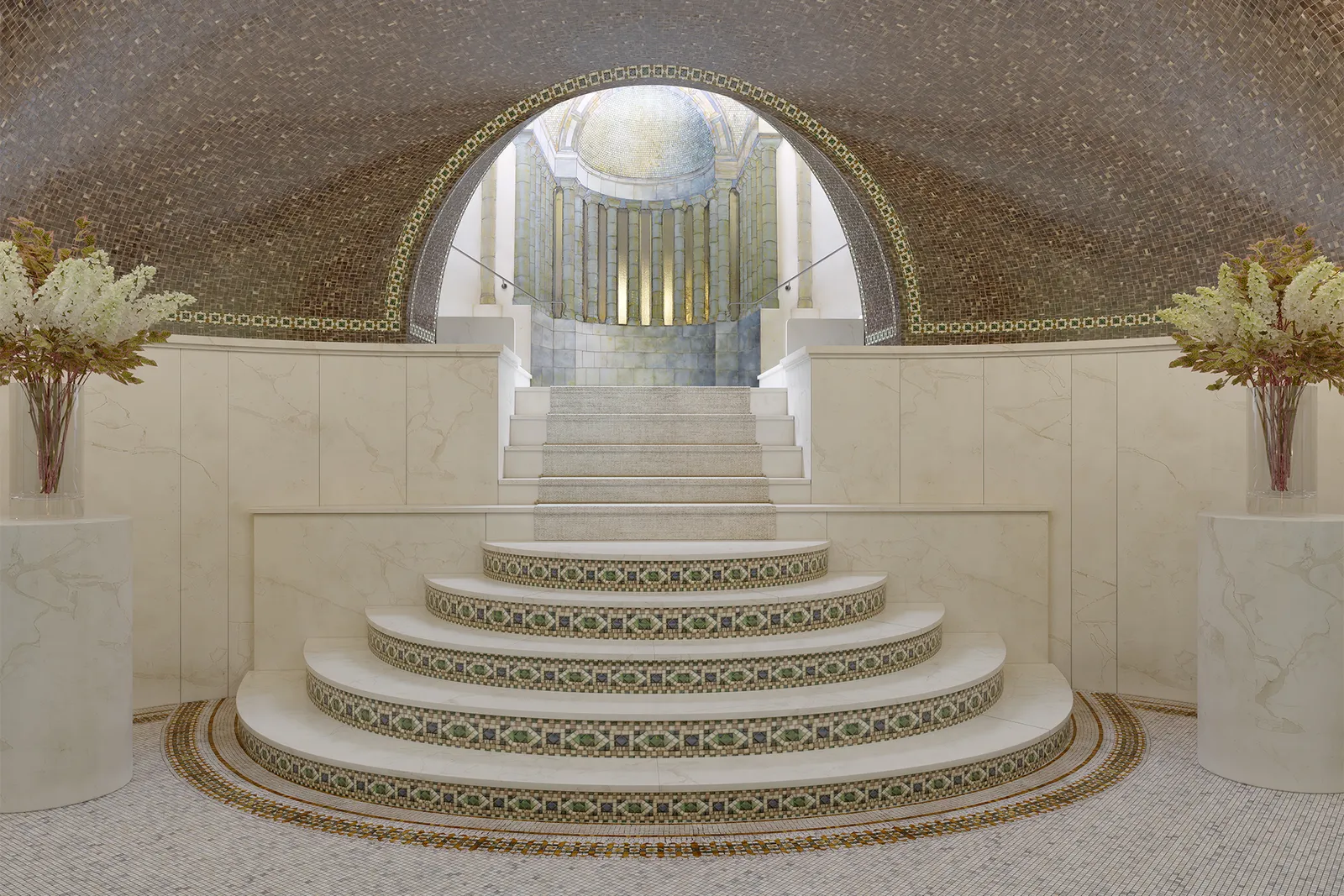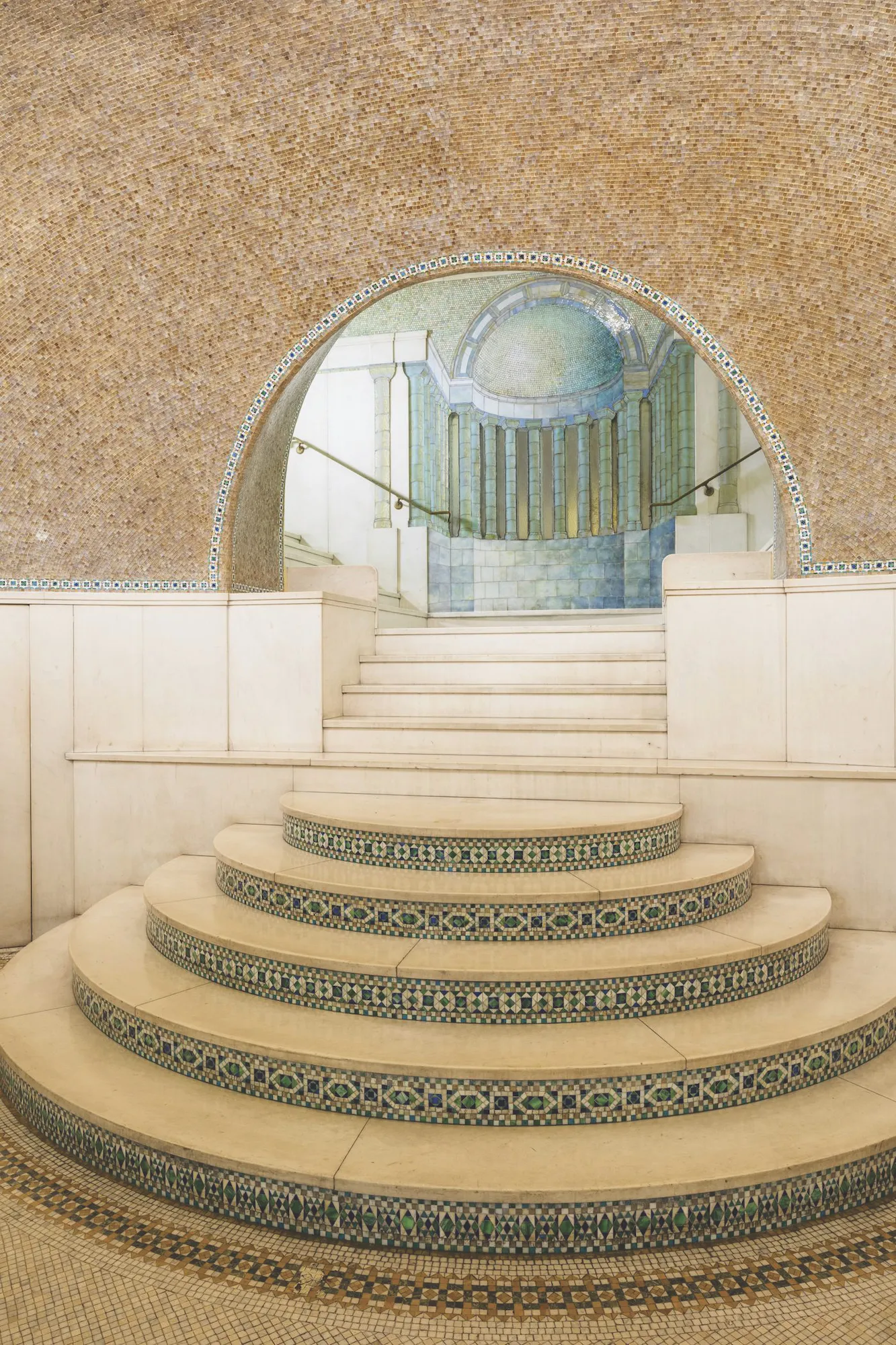그리스 신전 같은 형태에 기하학적인 모자이크로 장식된 저택의 중앙 계단