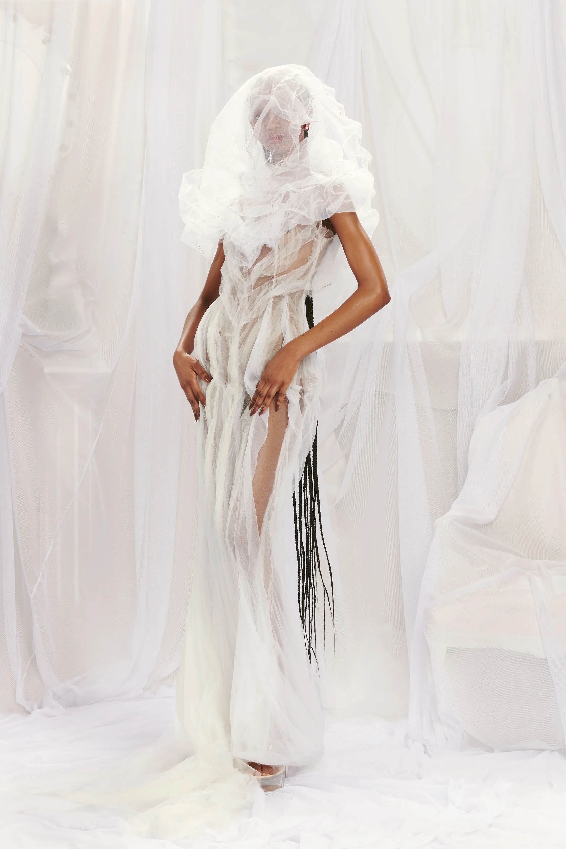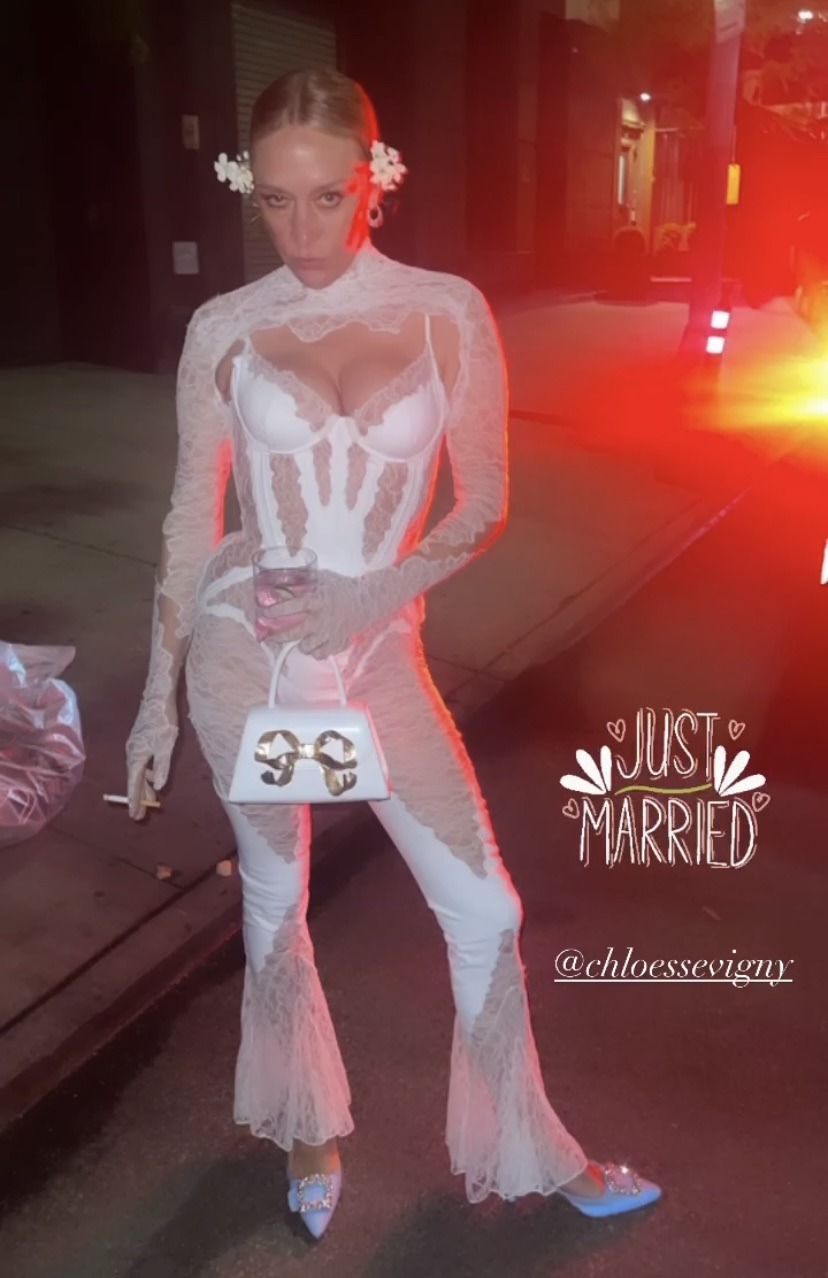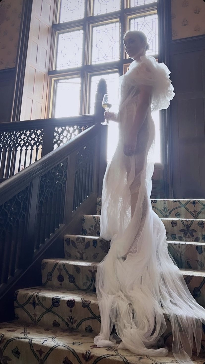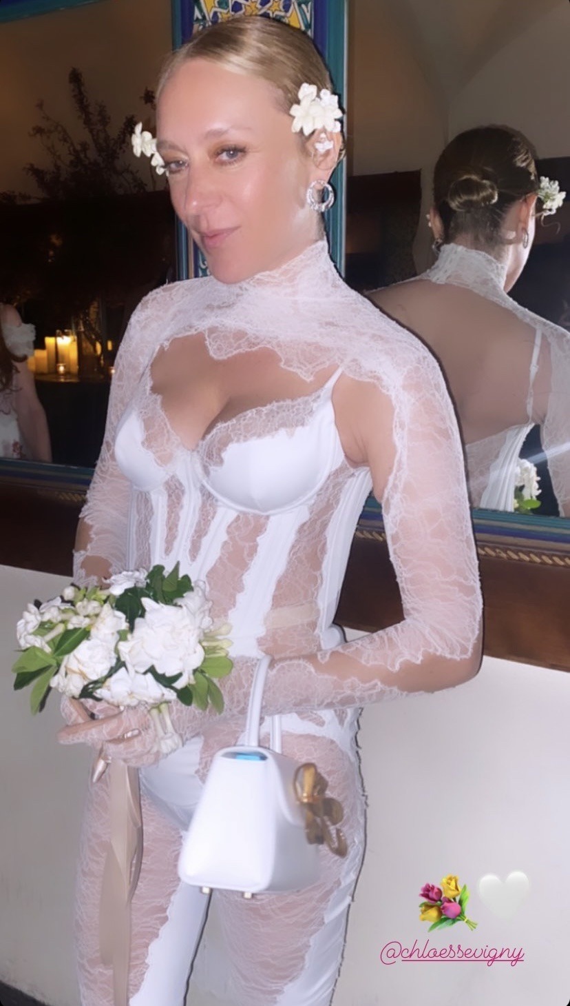 클로에 세비니는 자신의 결혼식을 위해 세벌의 흰색 드레스를 갈아입었는데, 본식 결혼식은 장 폴 고티에의 Glenn Martens가 디자인한 Spring 2022 쿠튀르 컬렉션 중 하나인 시스루 드레스