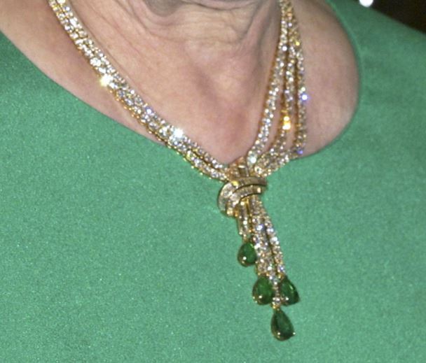 1989년 아랍에미리트 Sheikh Zayed bin Sultan Al Nahyan 대통령이 엘리자베스 2세에서 선물한 것으로 추측되는 에메랄드 테슬 귀걸이, 목걸이, 팔찌, 반지 주얼리 세트