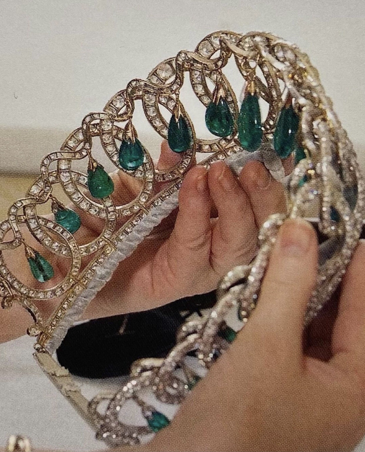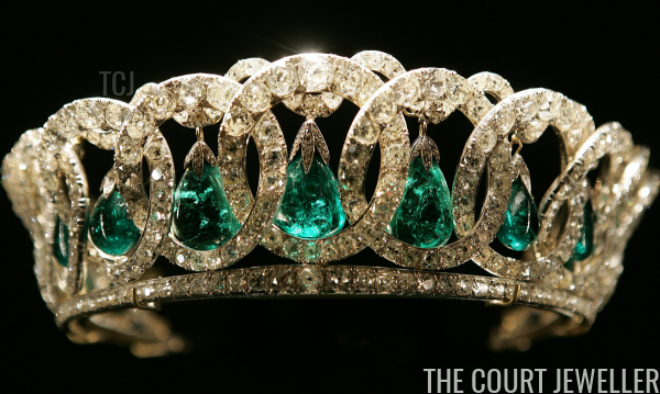 엘리자베스 2세의 대표적인 에메랄드 티아라. 메클렌부르크-슈베린의 마리가 러시아 로마노프 황실의 알렉산드로 2세의 아들 블라디미르 알렉산드로비치 대공과 결혼하면서 그를 대부분 블라디미르 대공비라고 부르게 됩니다.