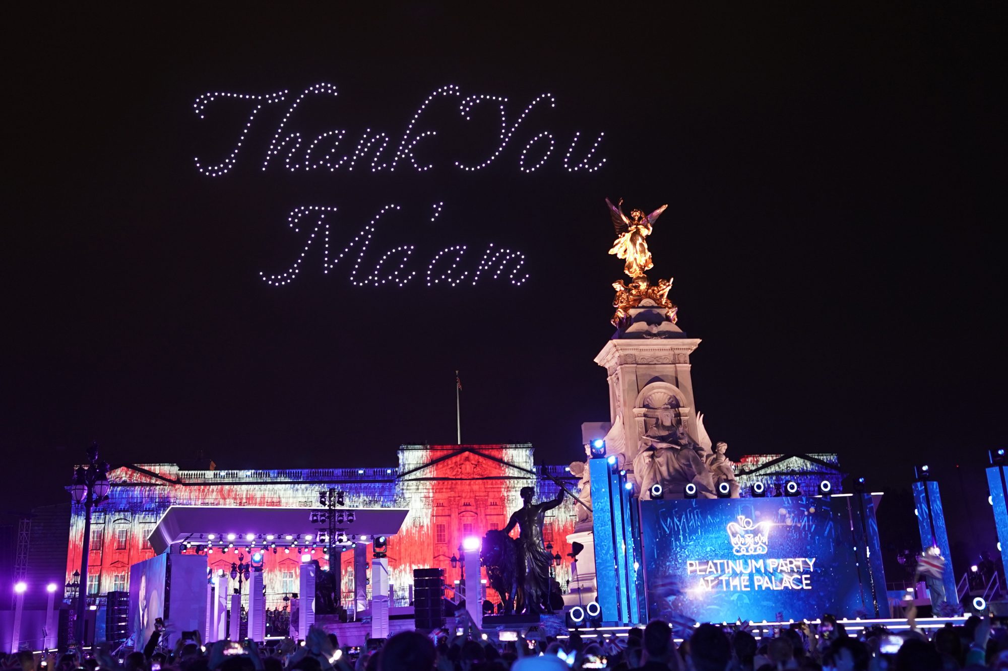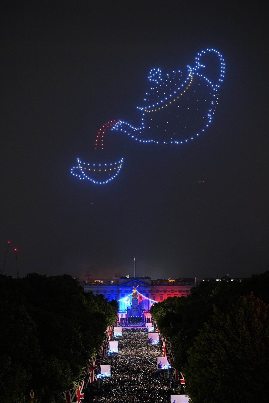 엘리자베스 2세를 상징하는 아이코닉한 모양들로 드론 쇼한 플래티넘 파티