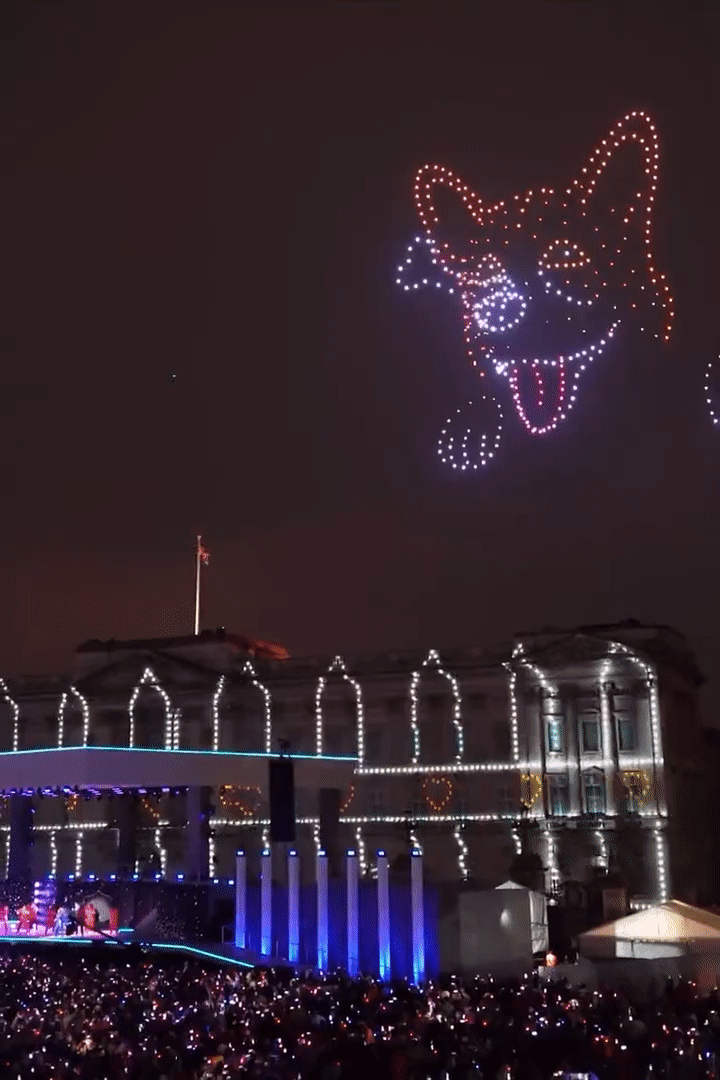 여왕을 상징하는 코기와 70주년을 축하하는 드론쇼