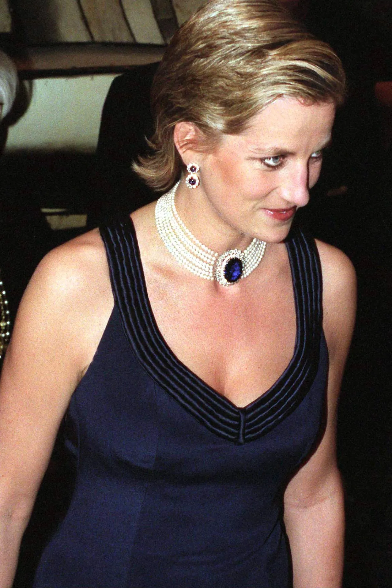 퀸 마더가 1981년 손자와 결혼하는 다이애나를 위해 선물한 사파이어 브로치로 새롭게 진주 초커를 만든 것으로 찰스 왕세자와 이혼 후에도 많이 착용한 진주 초커이에요. 1994년 남편이 카밀라 파커 보울스와 불륜을 인터뷰에서 인정하자 그 직후 이벤트에서 입은 왕실이 절대 허용 안 할 파격적인 검은색의 일명 'Revenge Dress' 복수의 드레스와 함께한 진주 초커