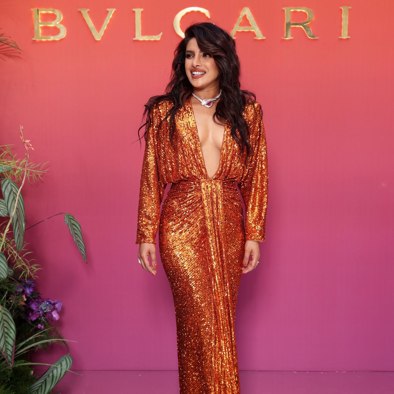 불가리 엠버서더로 파리에서 열린 Bvlgari Eden The Garden of Wonders 행사 온 프리앙카 초프라는 Rasario 드레스와 불가리 에덴 가든 컬렉션 중 하나인 스피넬 하이 주얼리 네크리스 착용-!