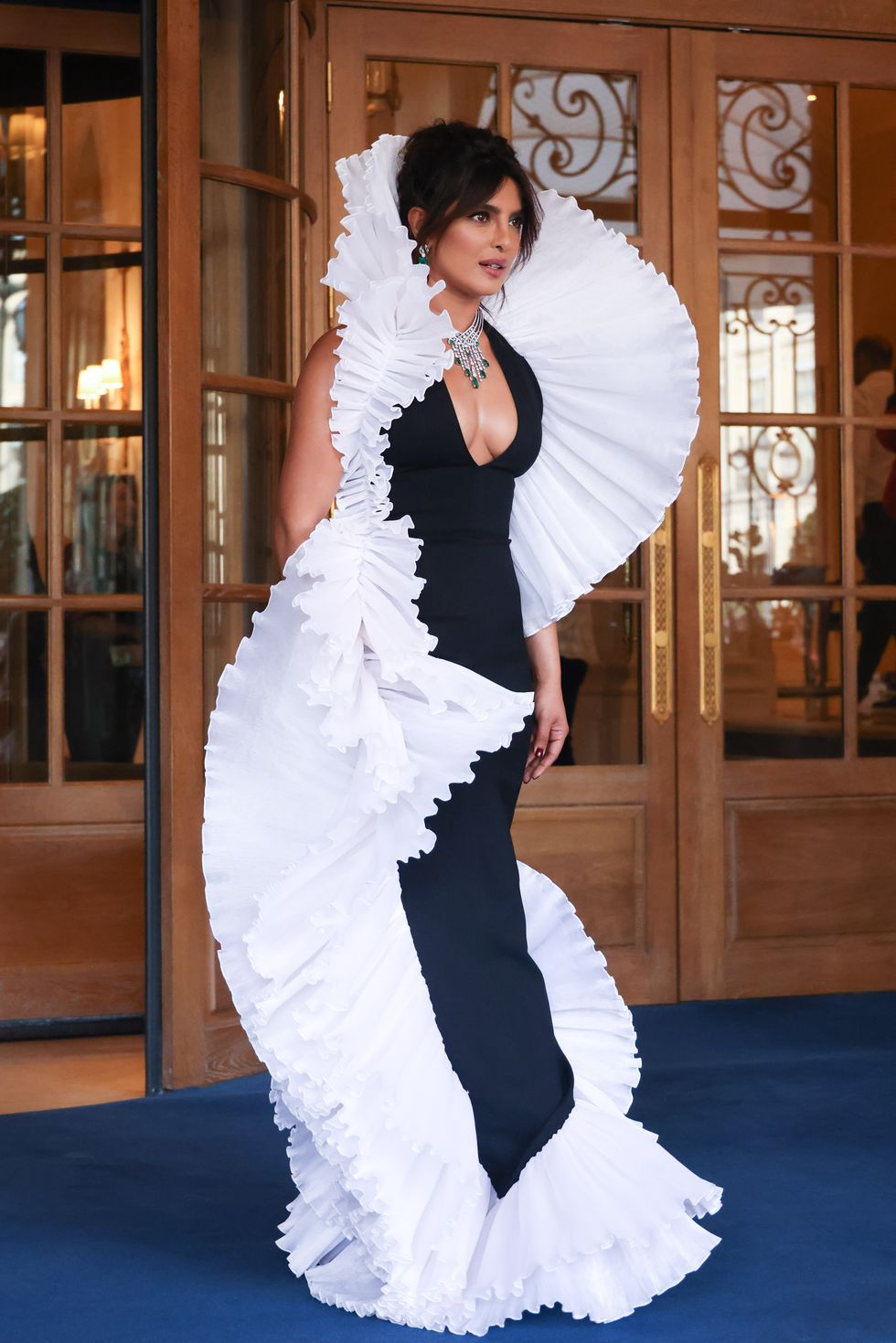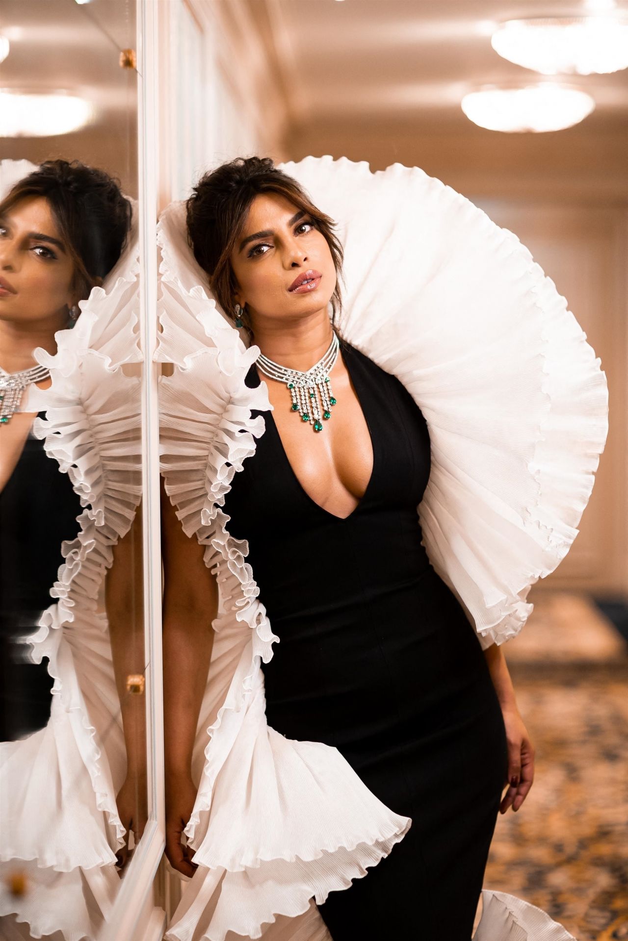 역시나 불가리의 에메랄드 다이아몬드 하이 주얼리 네크리스와 영국 디자이너 Robert Wun의 왕러플 드레스 입은 프리앙카 초프라