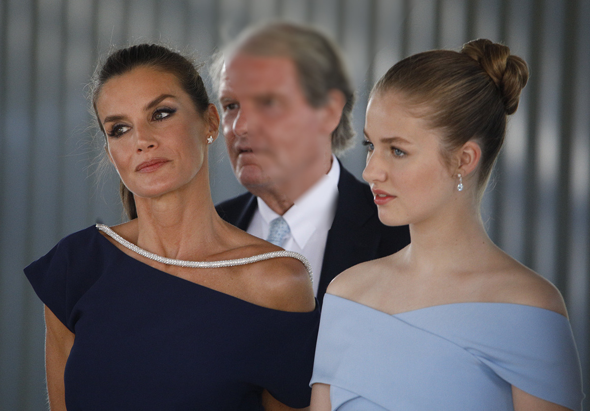 딸들과 함께한 레티시아 왕비는 비교적 저렴한 스페인 브랜드 Buret의 450유로짜리 네이비 오픈 숄더 드레스와 샤넬 Comète 귀걸이를 매치,