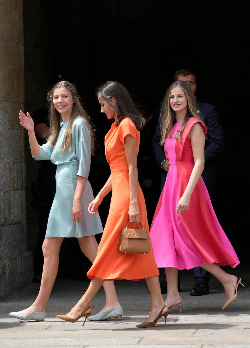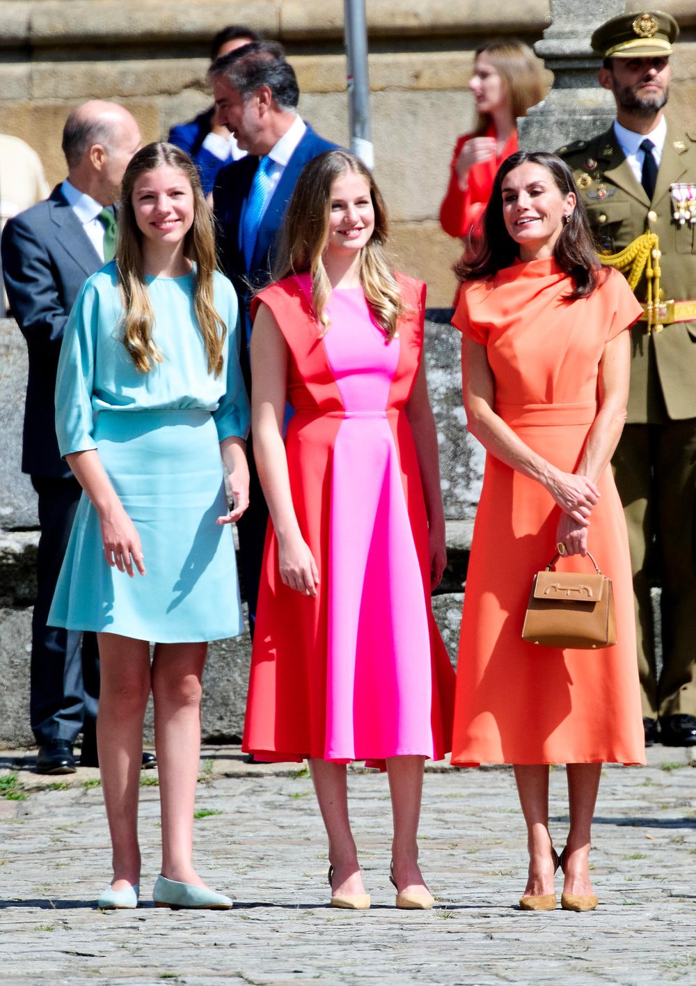 스페인 패션 브랜드 Vogana의 커스튬 오렌지 드레스를 입은 레티시아 왕비와 달리 레오노르 공주는 10만원대 초반의 비교적 저렴한 Cayro의 핑크 원피스를, 소피아 공주는 민트색의 원피스를 착용!