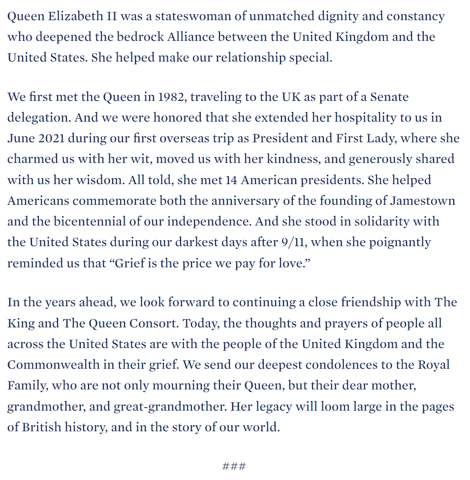 조 바이든 대통령·질 바이든 박사 "엘리자베스 2세 여왕은 군주 그 이상이었습니다. 그는 시대를 정의했습니다. 끊임없는 변화의 시대에서 여왕은 그 없이 그들의 나라를 결코 알지 못했던 많은 사람들을 포함해 수 세대의 영국인들에게 꾸준한 존재이자 위안과 자부심의 원천이었습니다···엘리자베스 2세는 9/11 이후 우리의 가장 어두운 날 동안 미국과 연대했고, 그때 그는 '슬픔은 우리가 사랑을 위해 지불하는 대가'라고 뼈저리게 상기시켰습니다··앞으로 우리는 왕과 왕비와 긴밀한 우정을 지속하길 바랍니다·· 여왕뿐만 아니라 사랑하는 어머니, 할머니, 증조할머니를 애도하고 있는 왕실 가족에게 깊은 애도를 표합니다··"