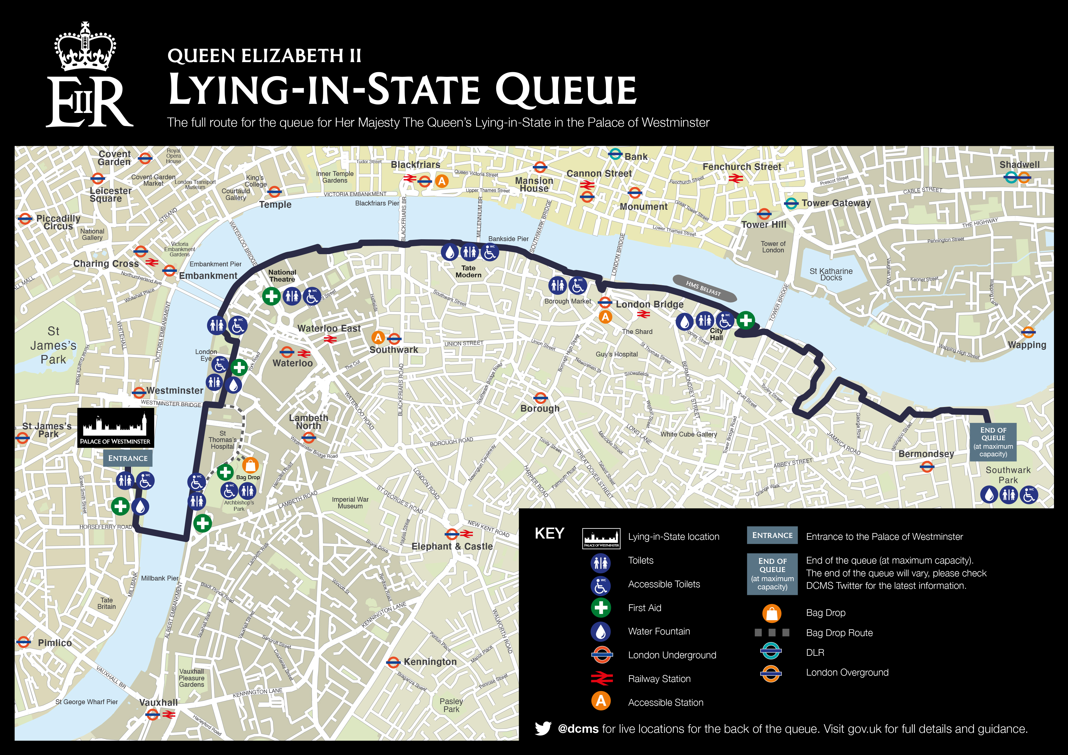 Lying in state, 9월 19일 웨스트민스터 사원에서 국장으로 치러질 장례식 전 대중들이 장례식 전 고인에게 조의를 표할 수 있는 전통인데요. 엄청난 인파가 예상되기 때문에 대중교통 이용의 지연을 물론, 여왕을 보려면 밤새 기다려야 할 수도 있는 가능성이 높아 보이네요. 최대 30시간의 대기시간을 경고하기도;