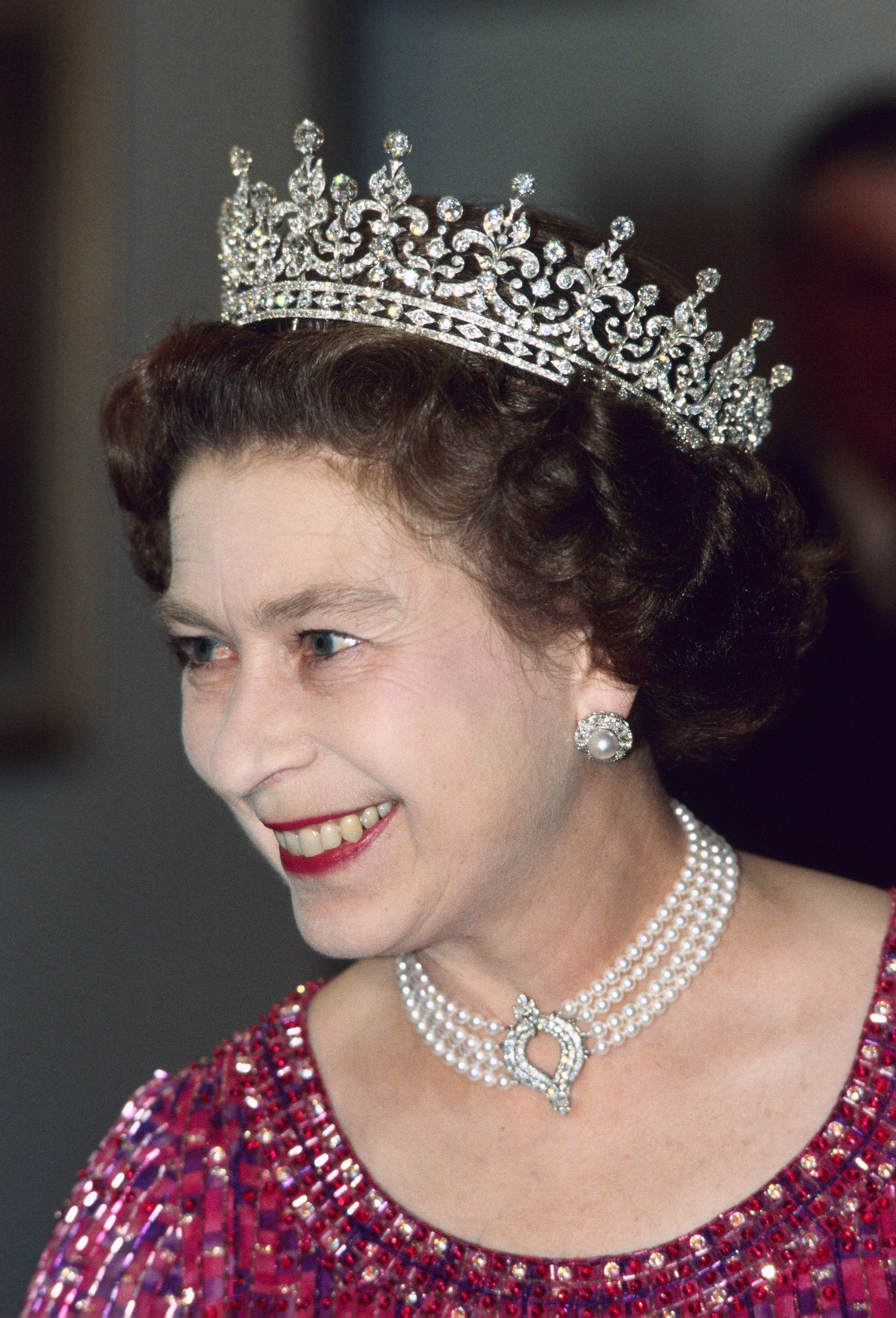 여왕이 선물 받은 최고급 양식 진주로 왕실 보석상 Garrad가 다이아몬드 크래스프를 달아 디자인한 것이 이 4줄 진주 초커! 이때 이후로 엘리자베스 2세는 방글라데시 방문 등 꽤나 중요한 행사들에 많이 착용하는 모습을 보였어요 여왕은 80년대 웨일스 공주에게 진주 초커를 빌려주기는 하나, 다이애나 스펜서가 이 진주 초커를 착용한 것은 단 한 번뿐!