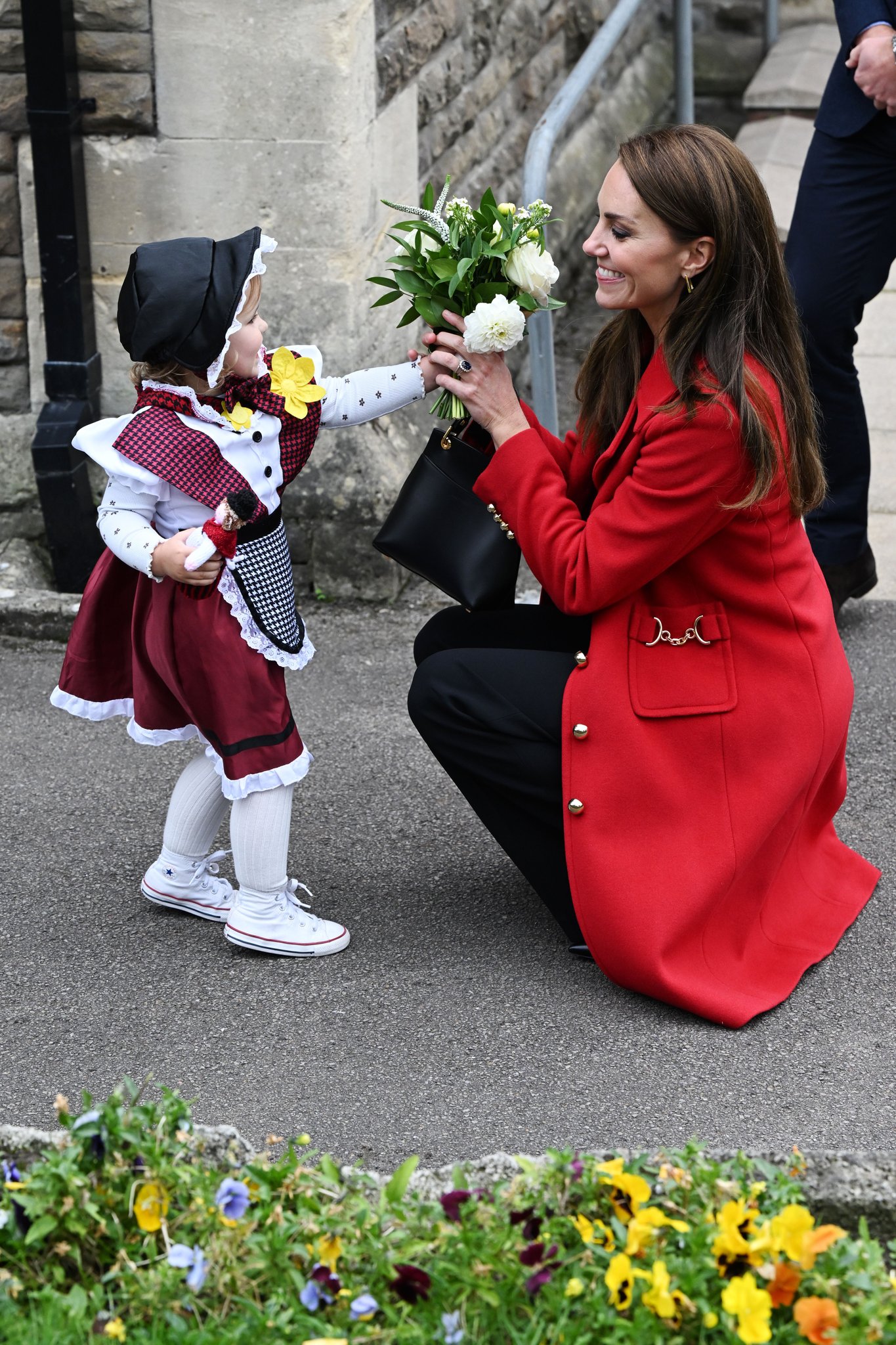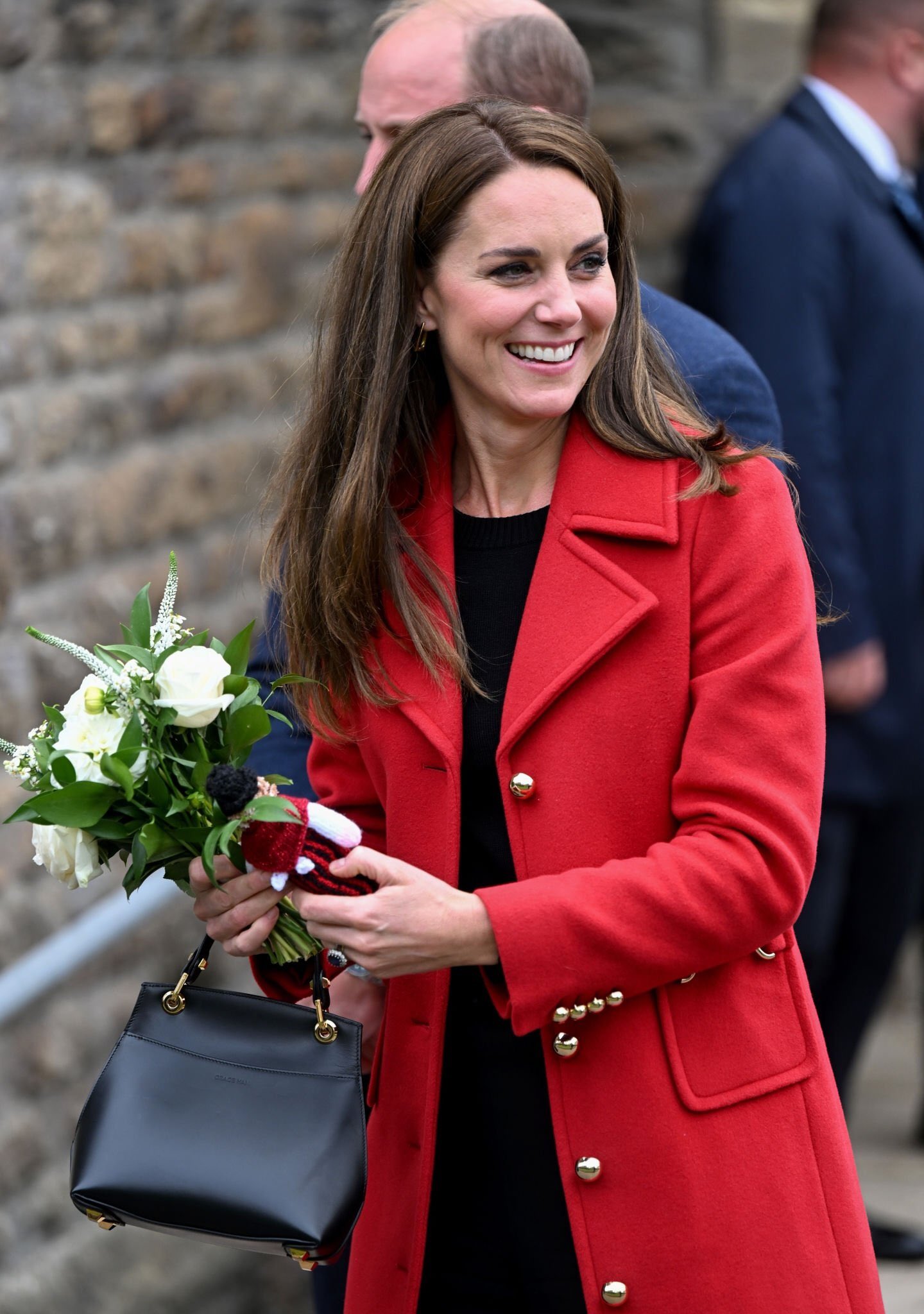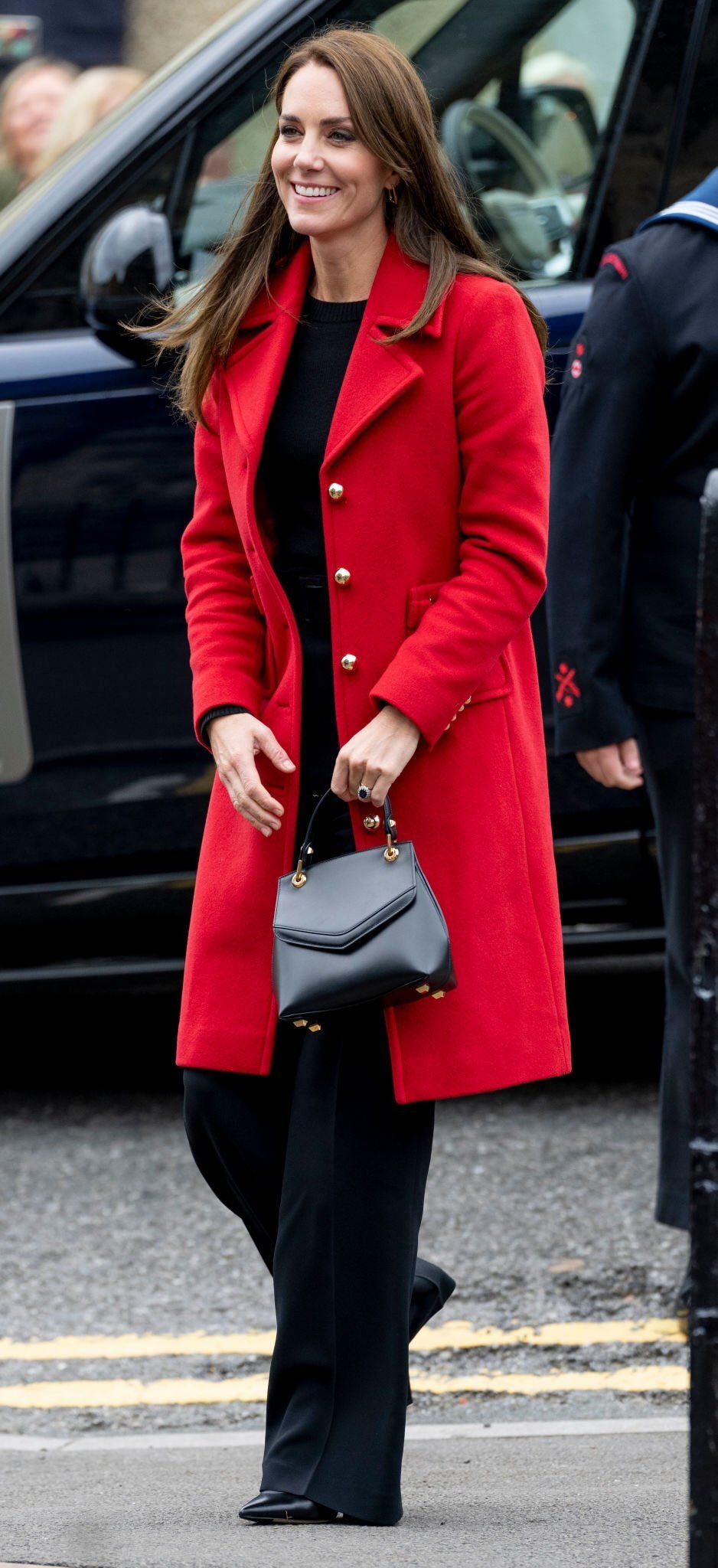 레드 드래곤이라 불리는 웨일스 국기를 오마주해 영국 패션 브랜드 L.K.Bennett의 '스펜서' 레드 코트를 착용한 케이트 미들턴은 요새 자주 들고 다니는 대만계 영국인 가방 브랜드 그레이스 한의 미니백를 다시 들었어요! 애도 기간 동안 진주 주얼리들을 했던 것과 다르게 오늘은 심플한 골드 귀걸이만 착용했어요.