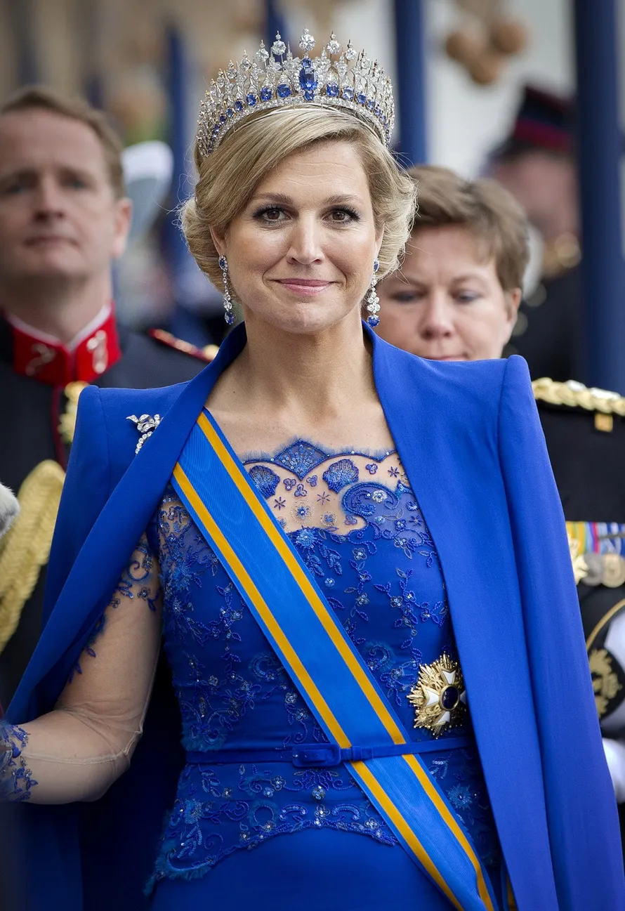 아무튼 이 날의 막시마 소레기에타, 세 딸들과 베아트릭스 (전) 여왕은 모두 선명하고 진한 로열 블루를 테마로 잡았습니다. 네덜란드 디자이너 Jan Taminiau가 디자인한 케이프 드레스를 입은 막시마는 티아라, 브로치, 귀걸이 모든 주얼리를 사파이어로 선택했어요.