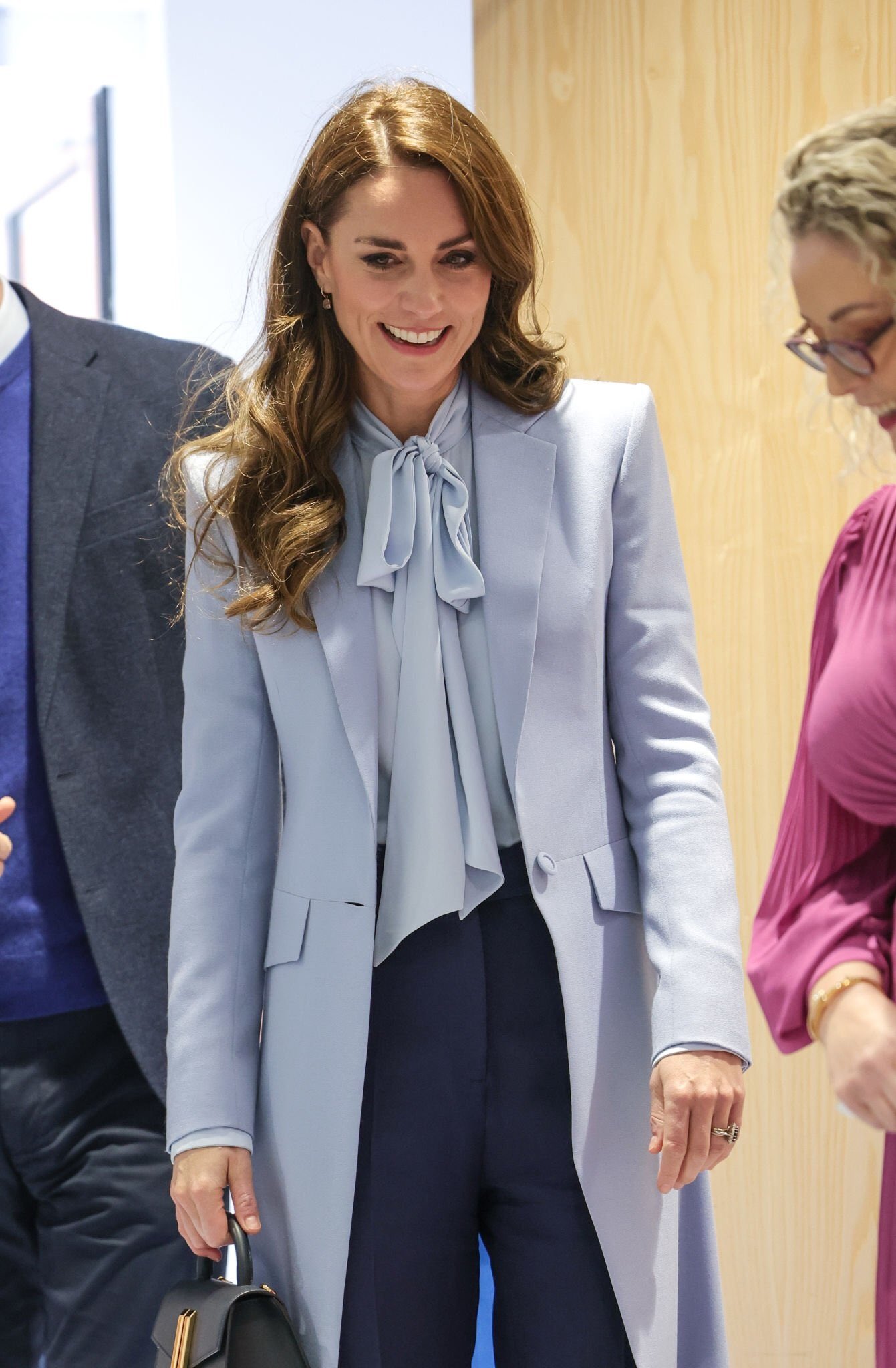 오늘의 케이트 미들턴은 마흔 기념 부부의 공동 초상화를 공개하러 갔을 때 입었던 연보랏빛 파랑색 롱코트를 다시 착용!