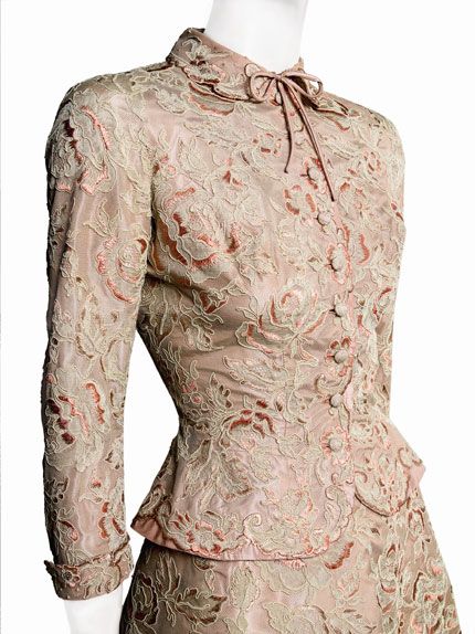 전설 아닌 레전드 웨딩드레스와 마찬가지로 헬렌 로즈가 디자인한 프렌치 알랑송 레이스로 완전히 덮힌 태피터로태피터로 만들어진 샴페인 색의 투피스 웨딩드레스