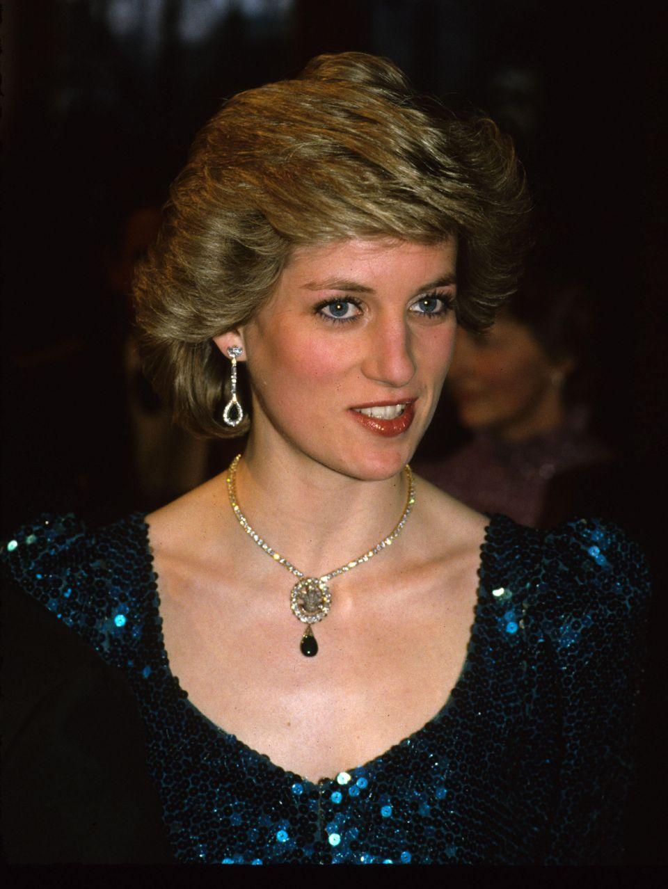 초커를 헤드피스로, 주얼리 변형을 즐겨했던 다이애나 스펜서는 Prince of Wales 브로치를 가슴에 달지 않고 목걸이 펜던트로 활용해 착용했어요! 사우디 아라비아 왕실로부터 선물 받은 다이아몬드 목걸이에 1981년 퀸 마더, 엘리자베스 보우스라이언에게 약혼 선물로 받은 웨일스 공 브로치를 달아 자신이 웨일스 공비라는 것을 대중에 공고히 알렸죠.