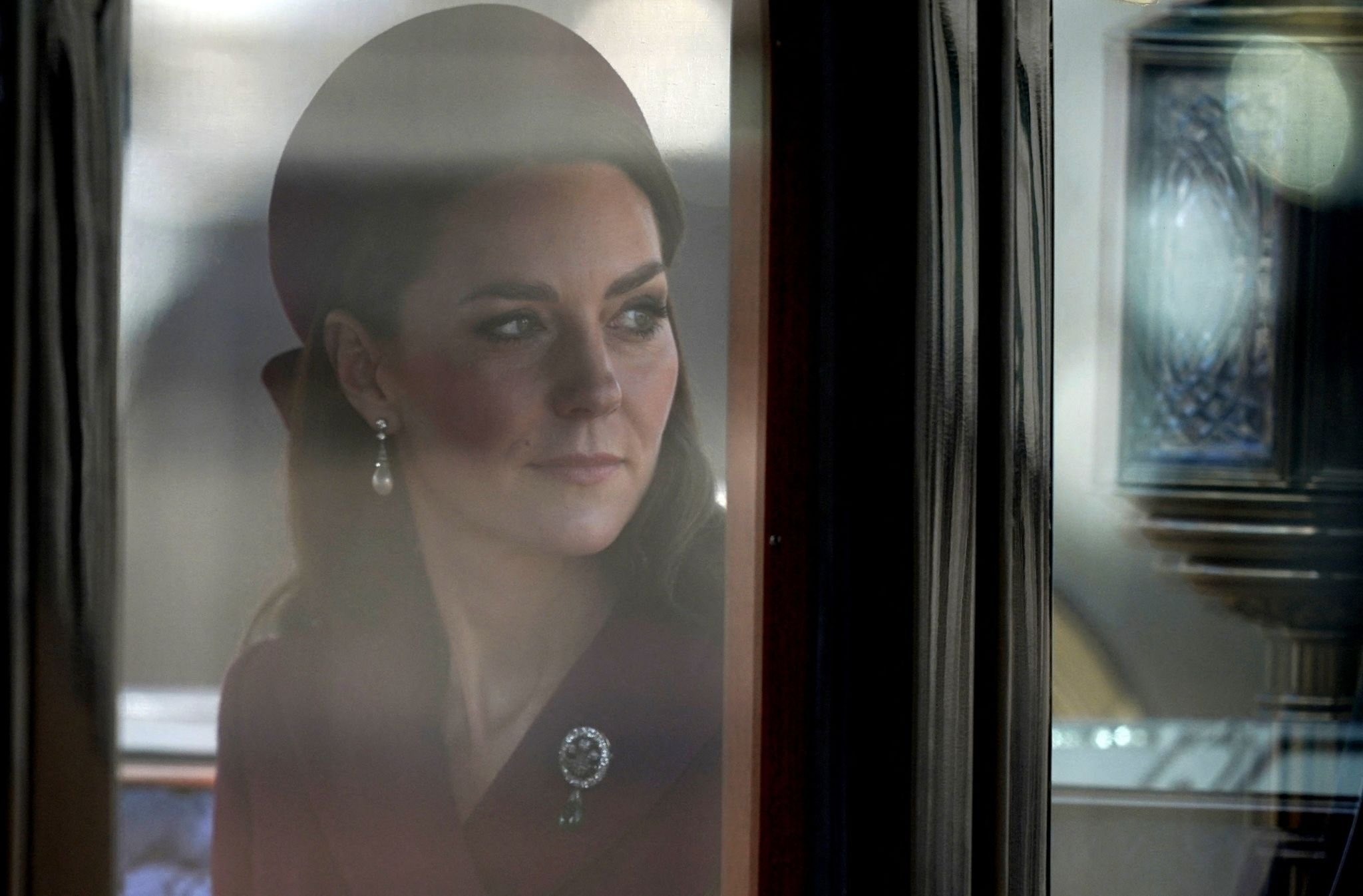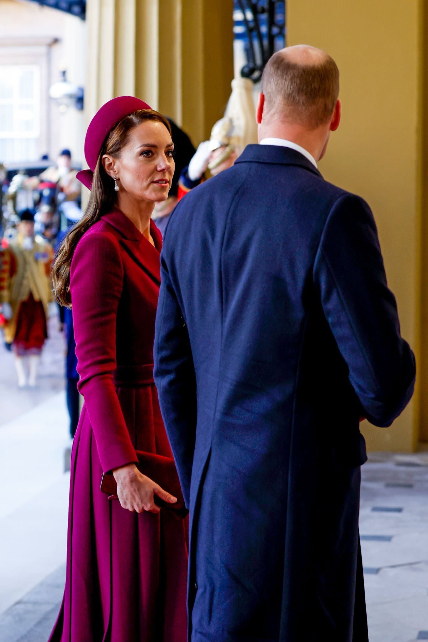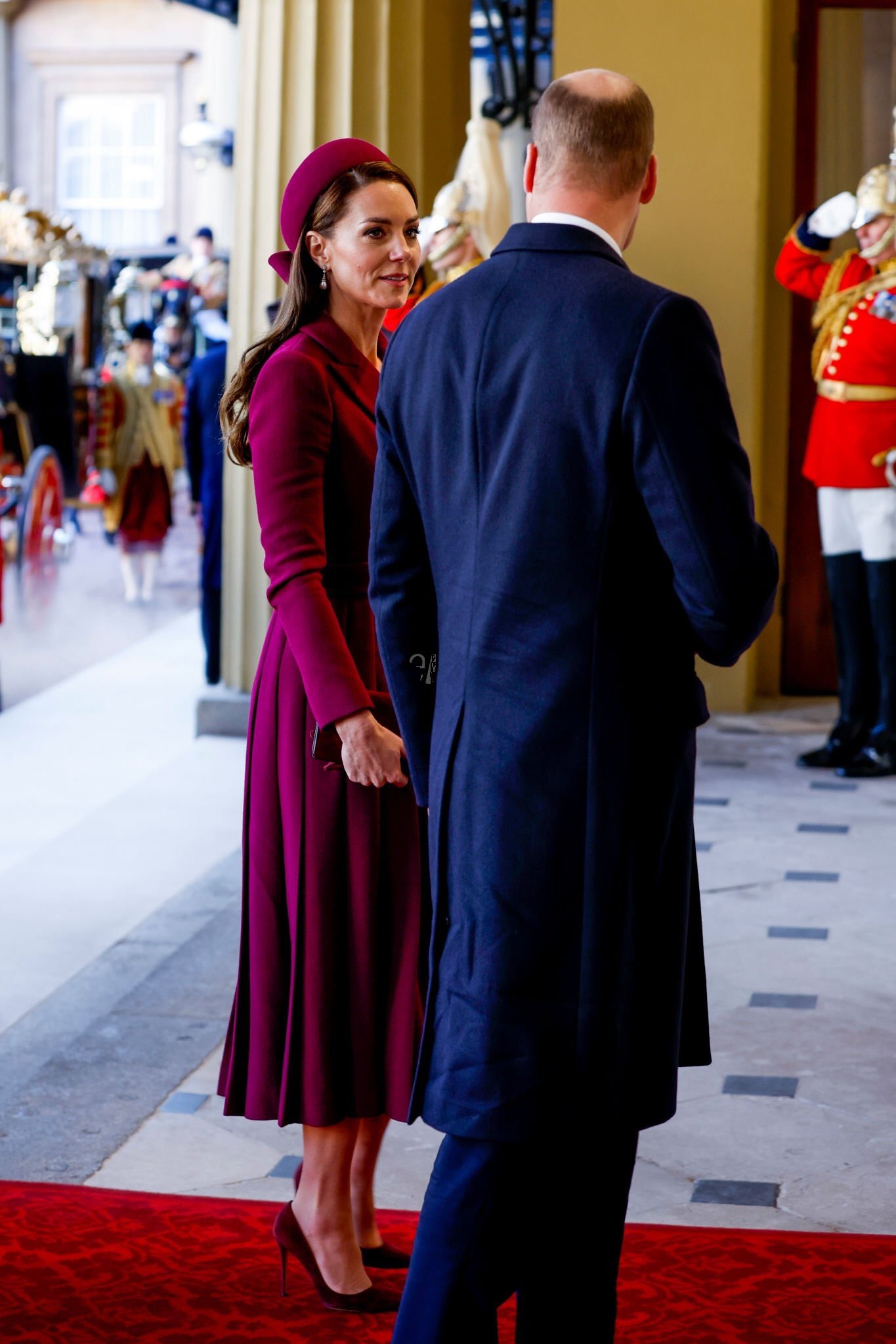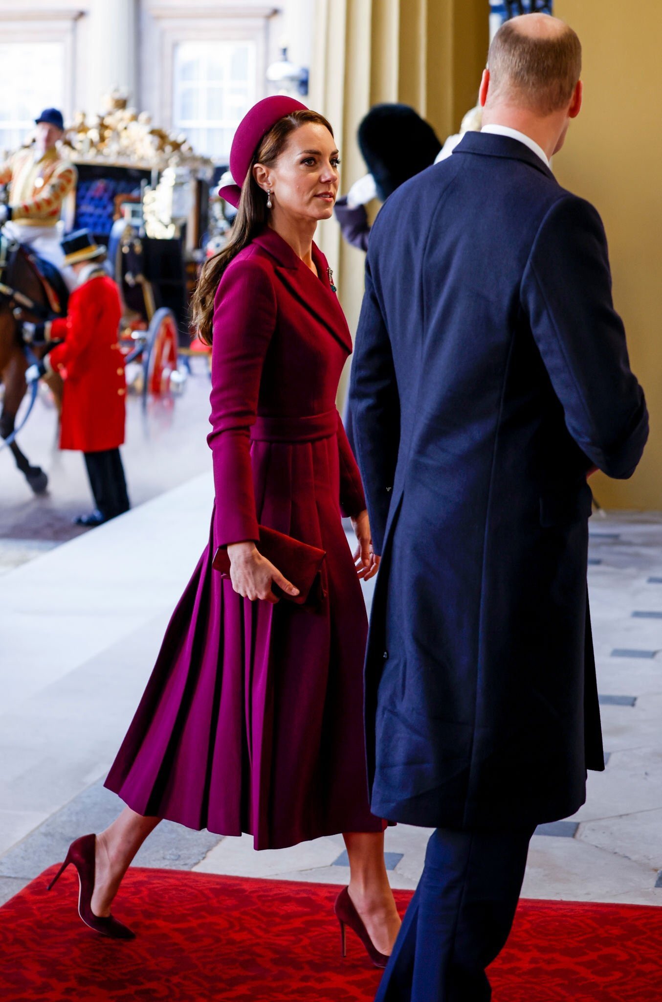 묘하게 언제나 어색한 웃음을 보여주는 윌리엄 왕자 옆에 영국 패션을 주도하는 케이트 미들턴은 말 그대로 머리부터 발끝까지 버건디로 치장했네요. 모자, 장갑, 클러치, 코트, 구두를 버건디 한 톤으로 맞춘 오늘의 케이트 미들턴에게 가장 돋보이는 것은!