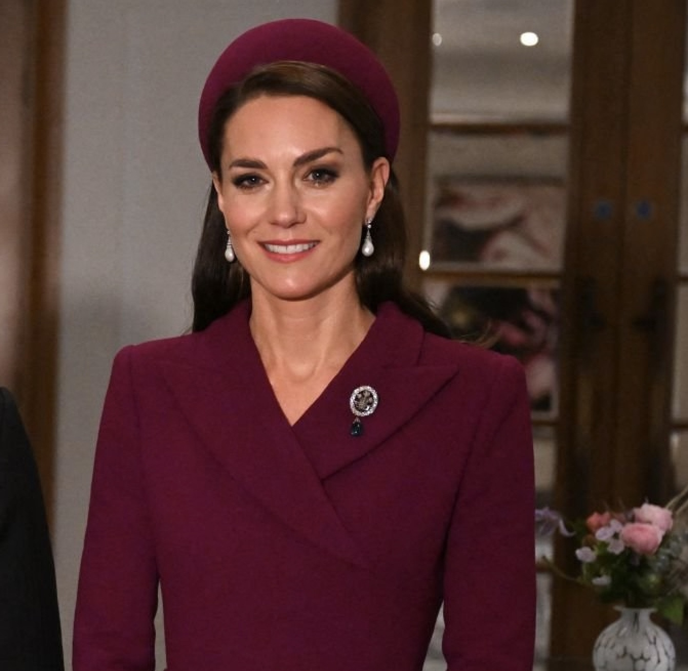 케이트 미들턴이 입은 톤 다운된 자주색 버건디의 코트 원피스는 에밀리아 윅스테드의 제품! 사실 아는 사람은 다 알다시피 케이트 미들턴이 선보이는 에밀리아 윅스테드 코트 원피스는 딱 떨어지게 깔끔 단정 디자인으로 프로토콜로 정해져 있는 마냥 일정하기 때문에.. 코트 원피스에 맞춰 오랜만에 보이는 필박스 모자까지 같은 색으로 매치했네요.