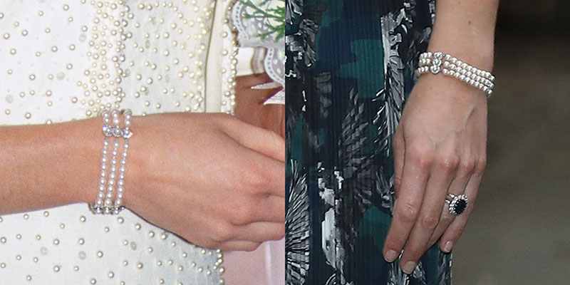 티아라와 매치한 다이애나 스펜서의 진주 다이아몬드 귀걸이.. 이날의 국빈 만찬에서 케이트 미들턴은 진주 세트를 완성시키려 4줄짜리 진주 브레이슬릿도 함께했습니다. 그전까지 케이트 미들턴의 팔찌 담당(?)은 다이애나 스펜서의 세 줄짜리 진주 브레이슬릿이라 이 진주 팔찌도 다이애나 소유였나..? 했더니
