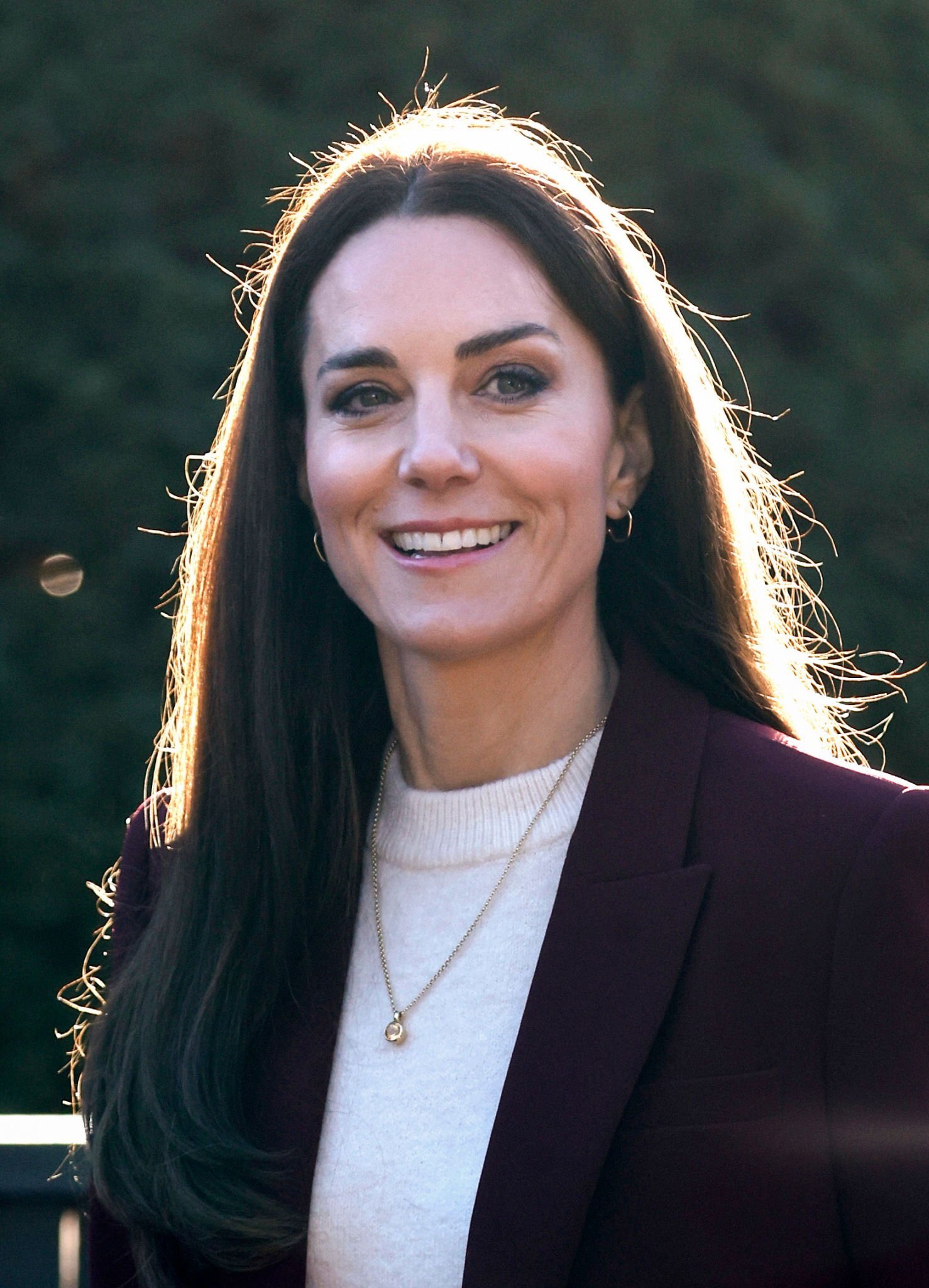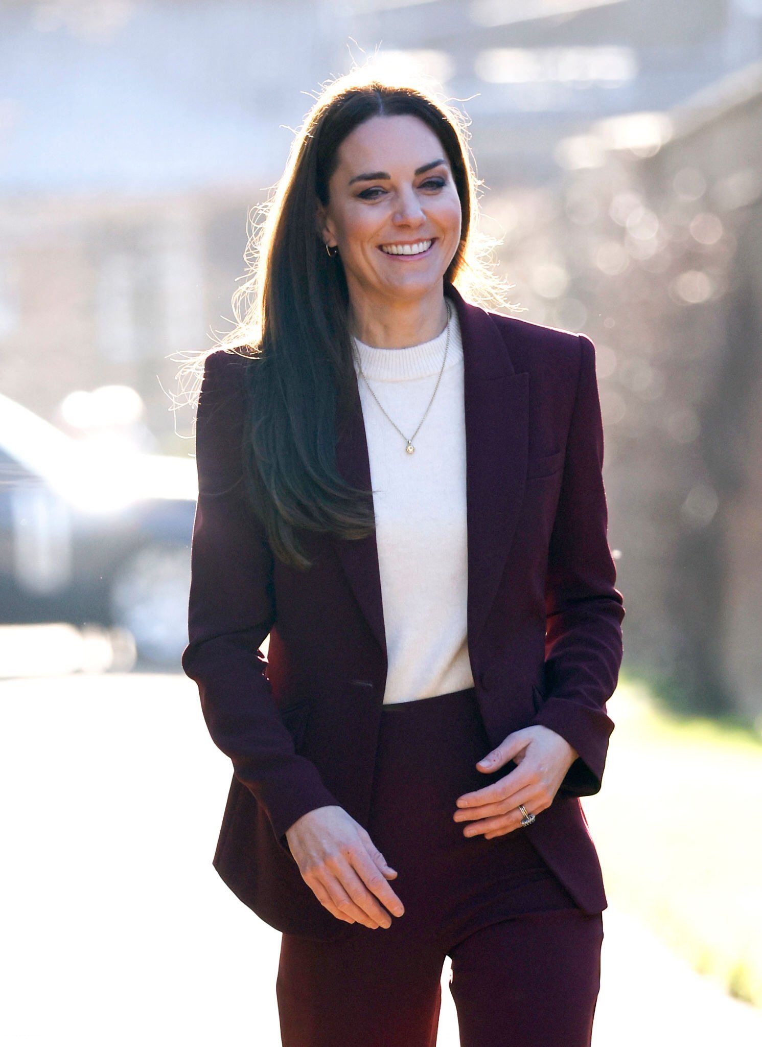 보스턴에서 처음으로 입었던 롤랑 무레의 버건디 슈트를 다시 입고 나온 케이트 미들턴은 이번에는 보우 블라우스가 아닌 하얀색 니트를 매치해 캐주얼한 슈트 스타일을 선보였어요.