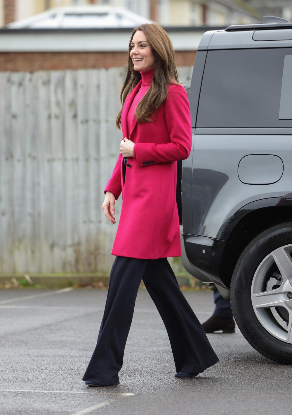 한때 악세사리 바이어로 일했던 직쇼 Jigsaw의 블랙 와이드 팬츠와 매치하며 영국 브랜드 홉스 Hobbs의 푸시아 코트와 목폴라에 집중하게 한 오늘의 케이트 미들턴 스타일에 대해서 딱히 할 말이 없는 게.. 2021년과 헤어스타일과 바지 기장만 달라졌을 뿐 그대로 다시 입고 나온 수준이기 때문이죠.