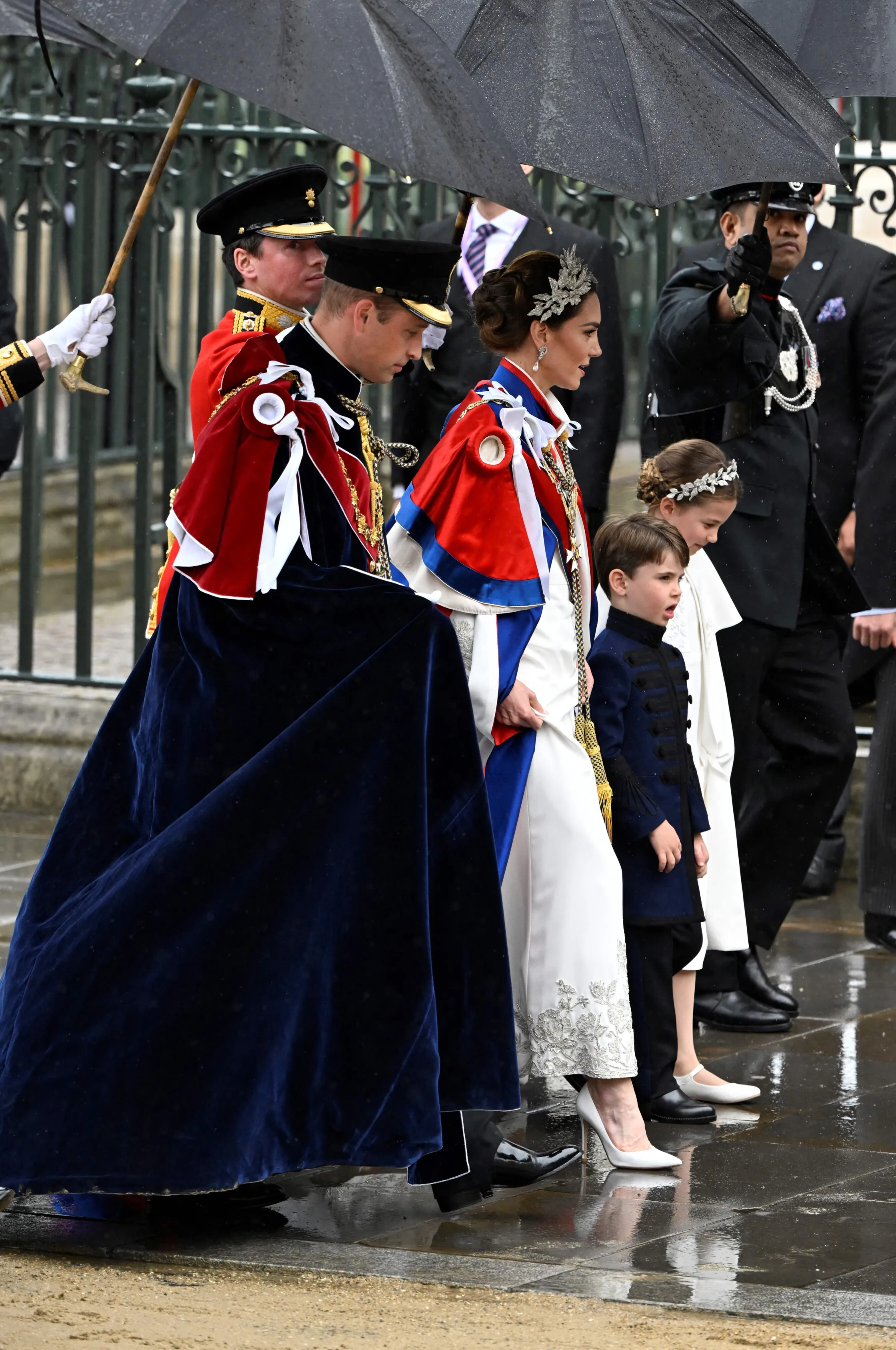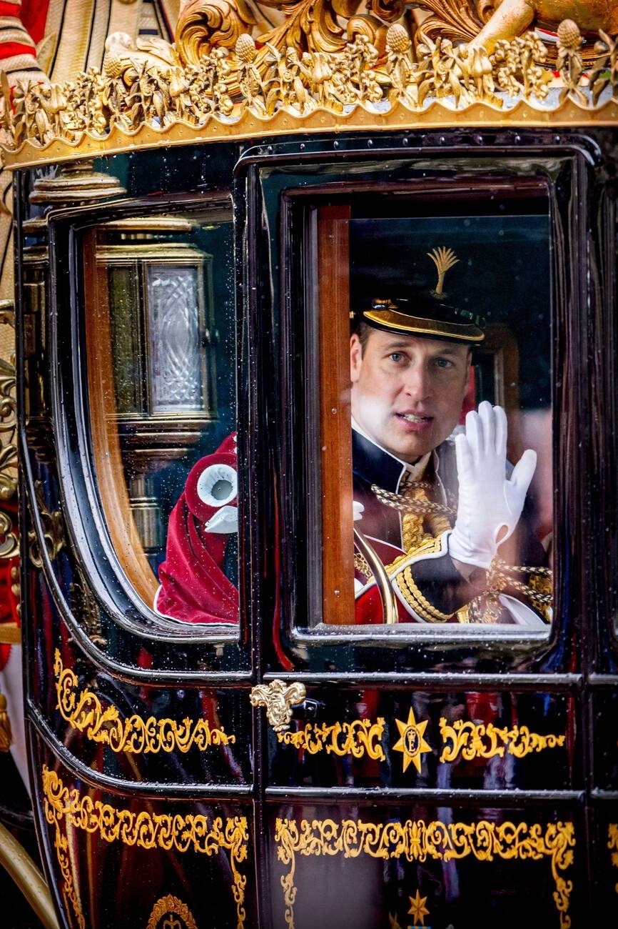 윌리엄 왕자는 영국 왕위 계승 1순위로서 웨일스 근위대 군복 위 짙은 파란색 실크 벨벳으로 만들어진 가터 훈장 맨틀을 착용했습니다. 디올의 킴 존스가 디자인한 모닝 슈트를 입은 남동생 해리 왕자와 달리 2008년 가터 훈장을 받아 1,000번째 Royal Knight로 임명된 윌리엄 왕자의 특권이죠.