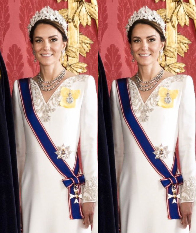 그럼 웨일스 공비는? 웨일스 공비는 가터 훈장 맨틀보다 더 밝은 검푸른 비단 새틴으로 만들어진 빅토리아 여왕 훈장 맨틀을 입었습니다. 빅토리아 여왕 훈장 맨틀 또한 입을 수 있는 인원은 소수로 제한되는데요. 찰스 3세 대관식에서는 케이트 미들턴, 에든버러 공작부인, 글로스터 공작부인, 알렉산드라 공주만이 그 명예를 받았습니다.