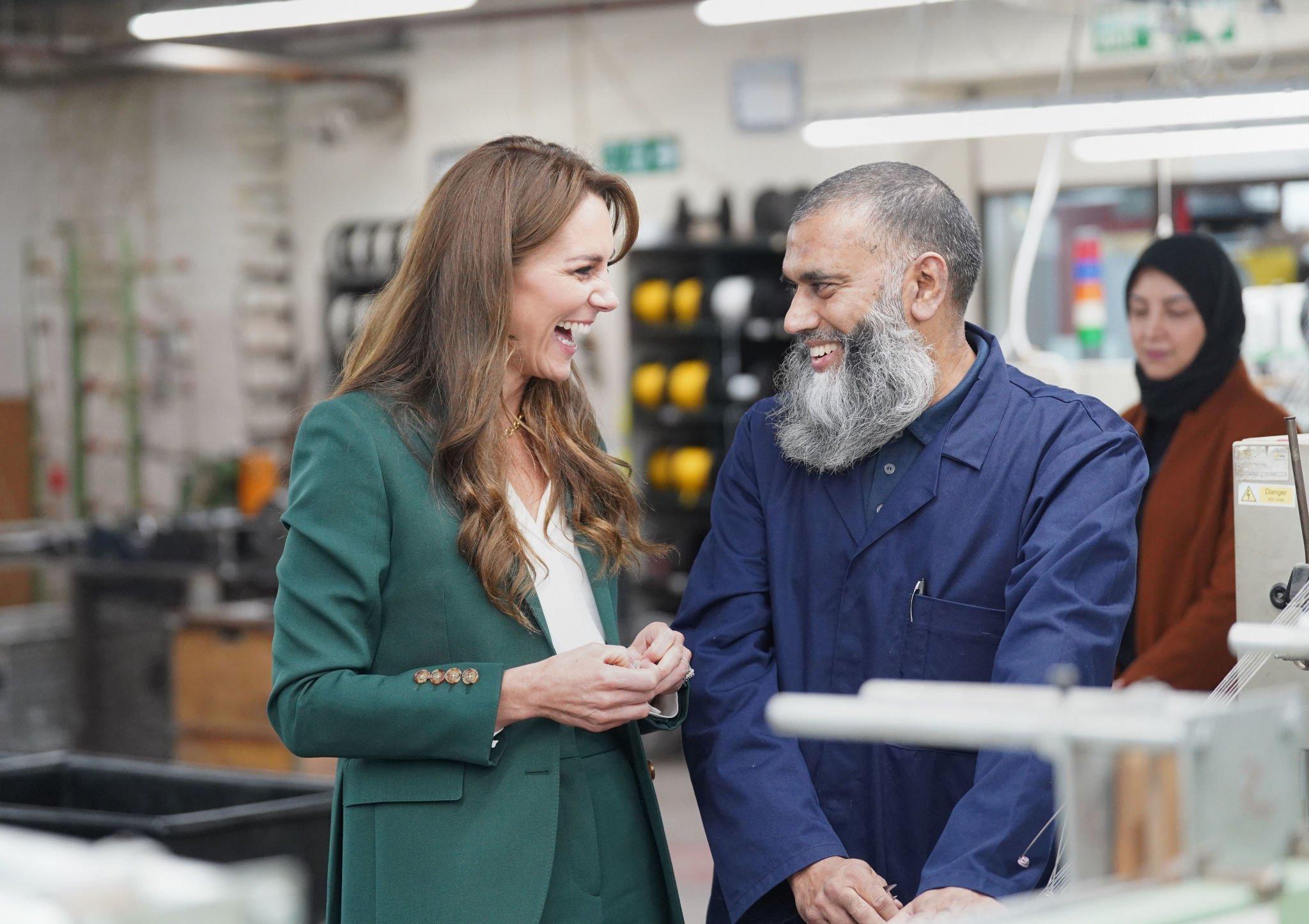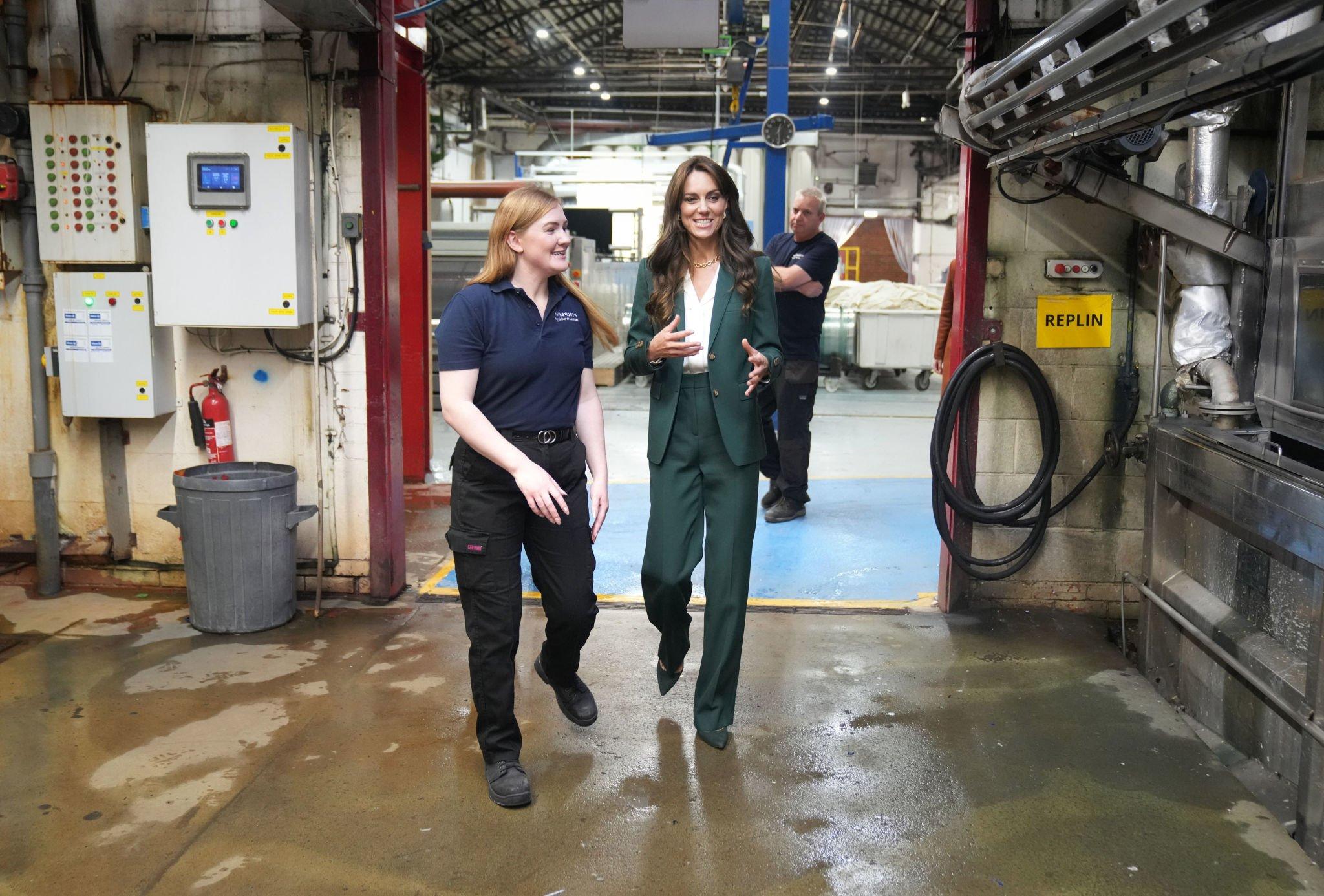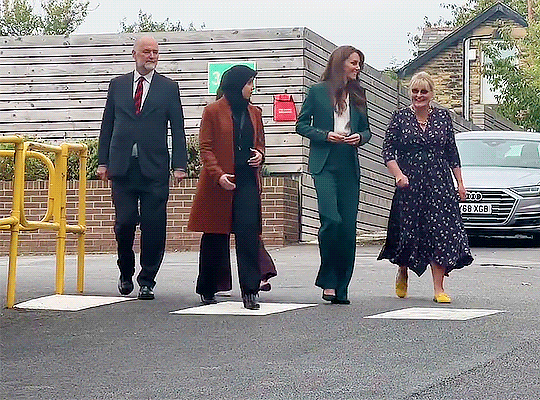 아무튼 오늘의 케이트 미들턴은 길어진 앞머리를 살며시 옆머리로 넘기고 나왔어요. 영국 섬유 산업의 유산과 지속가능한 직물에 대해 배우러 잉글랜드 리즈에 위치한 AW Hainsworth 방직공장을 방문한 웨일스 공비는 'Sustainable' 지속가능한 패션을 표면적으로나마 보여주기 위해 전에 착용했던 버버리 딥그린 슈트를 다시 한번 입었습니다.