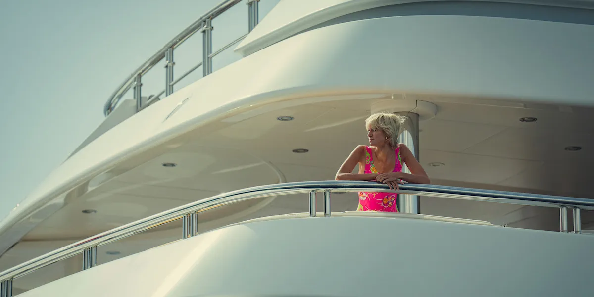 다이애나 스펜서의 마지막 나날을 연기할 엘리자베스 데비키는 <더 크라운> 시즌 6 포스터 속 그 유명한 다이애나 스펜서의 파란색 수영복 뒷모습을 보여주네요.